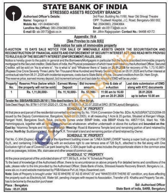 All that piece and parcel of the residential converted land bearing Sy. No. 115/4 (Conversion Order No. BDis: ALN(S)SR(KT)233/2004-05 issued by the Deputy Commissioner, Bangalore, dated 03.03.2005), in all measuring 1 Acre & 20 guntas, Situated at Kengeri Village, Kengeri Hobli, Bangalore South Taluk, presently comes under BBMP limits, vide BBMP Khata No. 4857/115/4, Ward No. 198-Hemmingepura, together with all rights, appurtenances whatsoever, whether underneath or above the surface and bounded on the: East by: Yelamma Temple and Vidyapeetha land., West by: Road & Maramma Temple land and remaining portion of land retained by Owner, North by: Buddanna's land, South by: K.R. Timmaiah's land and remaining portion of land retained by Owner. SCHEDULE "B" PROPERTY Flat No. C-304 (Duplex) in Third Floor in the Apartment building known as "LINEA SUNFLOWER" having a super built up area of 1758 Sq.ft., and containing 3 Bedroom along with an exclusive right to use terrace area of 728 Sq.ft., attached to the flat along with One Exclusive right of use of Covered Car park bearing No. C-304 (super built-up area includes the proportionate share in the common area such as passages, lobbies, lifts, staircase and other areas of common use).