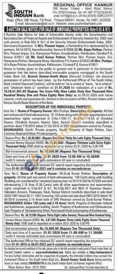Name of Property Owner: Mrs. Pushpa, Description of property: All that part and parcel of land admeasuring 16.19 Ares along with all other appurtenance and easementary rights comprised in S.No.1158117. Re S.No. 114/2A of Chirakkal Desom, Chirakkal Amsom, Kannur Taluk, Kannur District morefully described in partition deed 778/2010 dated 27-02-2010 of SRO Valapattanam owned by Pushpa. BOUNDARIES: North: Private property, South Property of Rajan Pothan, East: Common Road and West: Private property