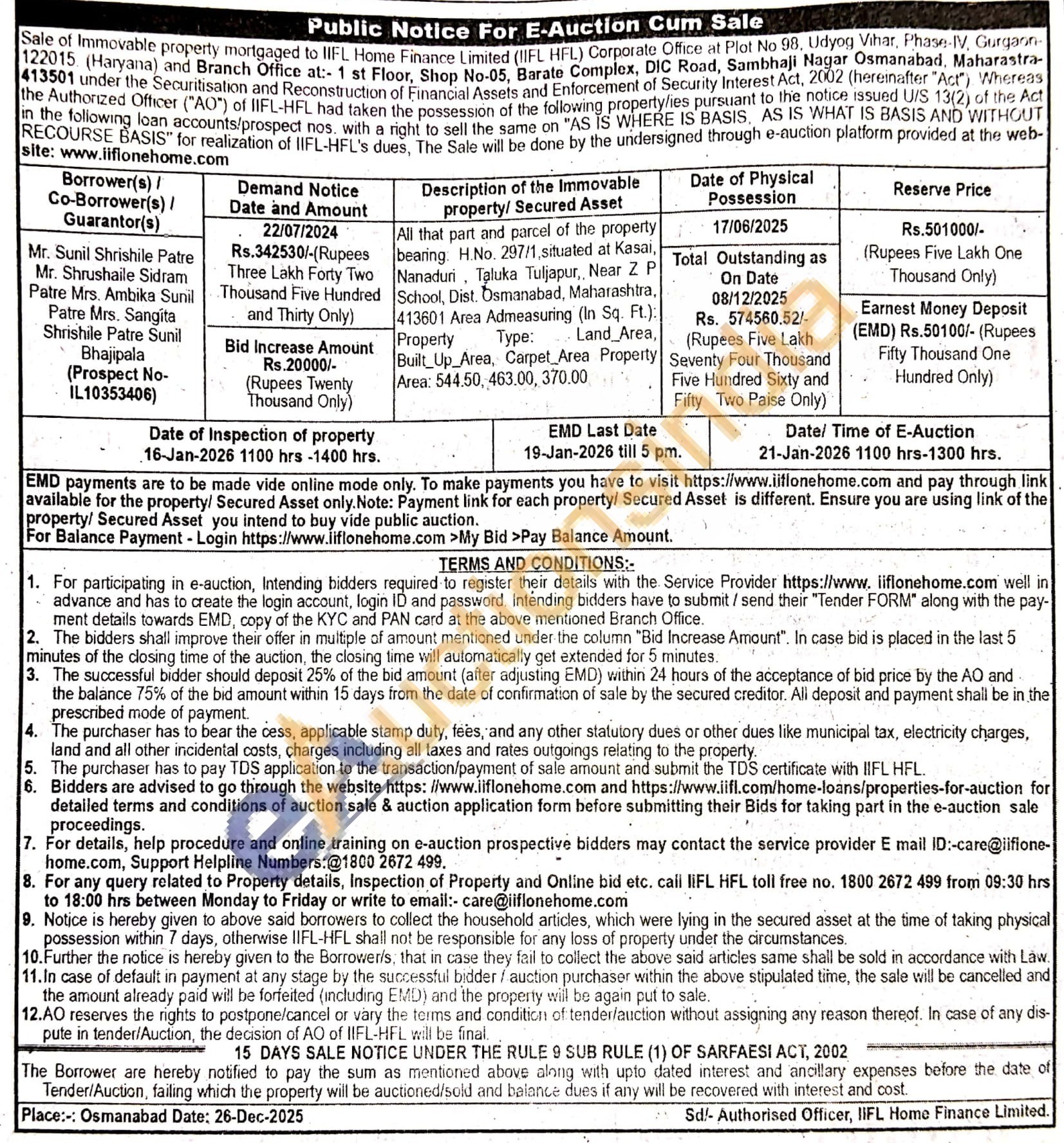 All that part and parcel of the property bearing H.No. 297/1, situated at Kasai, Nanaduri Taluka Tuljapur, Near Z P School, Dist. Osmanabad, Maharashtra, 413601 Area Admeasuring (In Sq. Ft.): Type: Property Land Area, Built_Up_Area, Carpet Area Property Area: 544.50, 463.00, 370.00