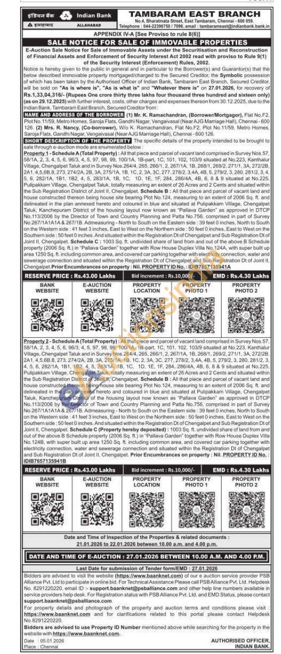 Schedule A (Total Property): All that piece and parcel of vacant land comprised in Survey Nos.57, 58/1A, 2, 3, 4, 5, 6, 96/3, 4, 5, 97, 98, 99, 100/1A, 1B-part, 10, 101, 102, 103/9 situated at No 223, Kanthalur Village, Chengalpet Taluk and in Survey Nos 264/4, 265, 266/1, 2, 267/1A, 1B, 268/1, 269/2, 271/1, 3A, 272/28, 241,4,5,68.8, 273, 274/24, 28, 3A, 275/1A, 1B, 1C, 2, 3A, 3C, 277, 278/2, 3.4A, 48, 5, 279/2, 3, 280, 281/2.3. 4, 5, 6, 282/1A, 181, 182, 4, 5, 283/14, 18, 10, 10, 15, 1F, 284, 2864A, 48, 6, 8 & 9 situated at No.225. Pulipakkam Village, Chengalpet Taluk, totally measuring an extent of 26 Acres and 2 Cents and situated within the Sub Registration District of Joint II, Chengalpet. Schedule B: All that piece and parcel of vacant land and house constructed thereon being house site bearing Plot No. 124, measuring to an extent of 2006 Sq. ft. and delineated in the plan annexed hereto and coloured in blue and situated at Pulipakkam Village, Chengalpet Taluk, Kanchepuram District of the housing layout now known as "Pallava Garden" as approved in DTCP No.113/2006 by the Director of Town and Country Planning and Patta No.756, comprised in part of Survey No.267/1A1A1A & 267/18, Admeasuring-North to South on the Eastern side: 39 feet 0 inches, North to South on the Western side: 41 feet 3 inches, East to West on the Northern side: 50 feet 0 inches, East to West on the Southern side: 50 feet 0 inches. And situated within the Registration Dt of Chengalpet and Sub Registration Dt of Joint II, Chengalpet. Schedule C (Property hereby deposited): 1003 Sq. ft. undivided share of land from and out of the above B Schedule property (2006 Sq. ft.) in "Pallava Garden" together with Row House Duplex Villa No. 1248, with super built up area 1250 Sq. ft. including common area, and covered car parking together with electricity connection, water and sewerage connection and situated within the Registration Dt of Chengalpet and Sub Registration Dt of Joint II, Chengalpet. Prior Encumbrances on property: Nil. PROPERTY ID No.: IDIB76571359418