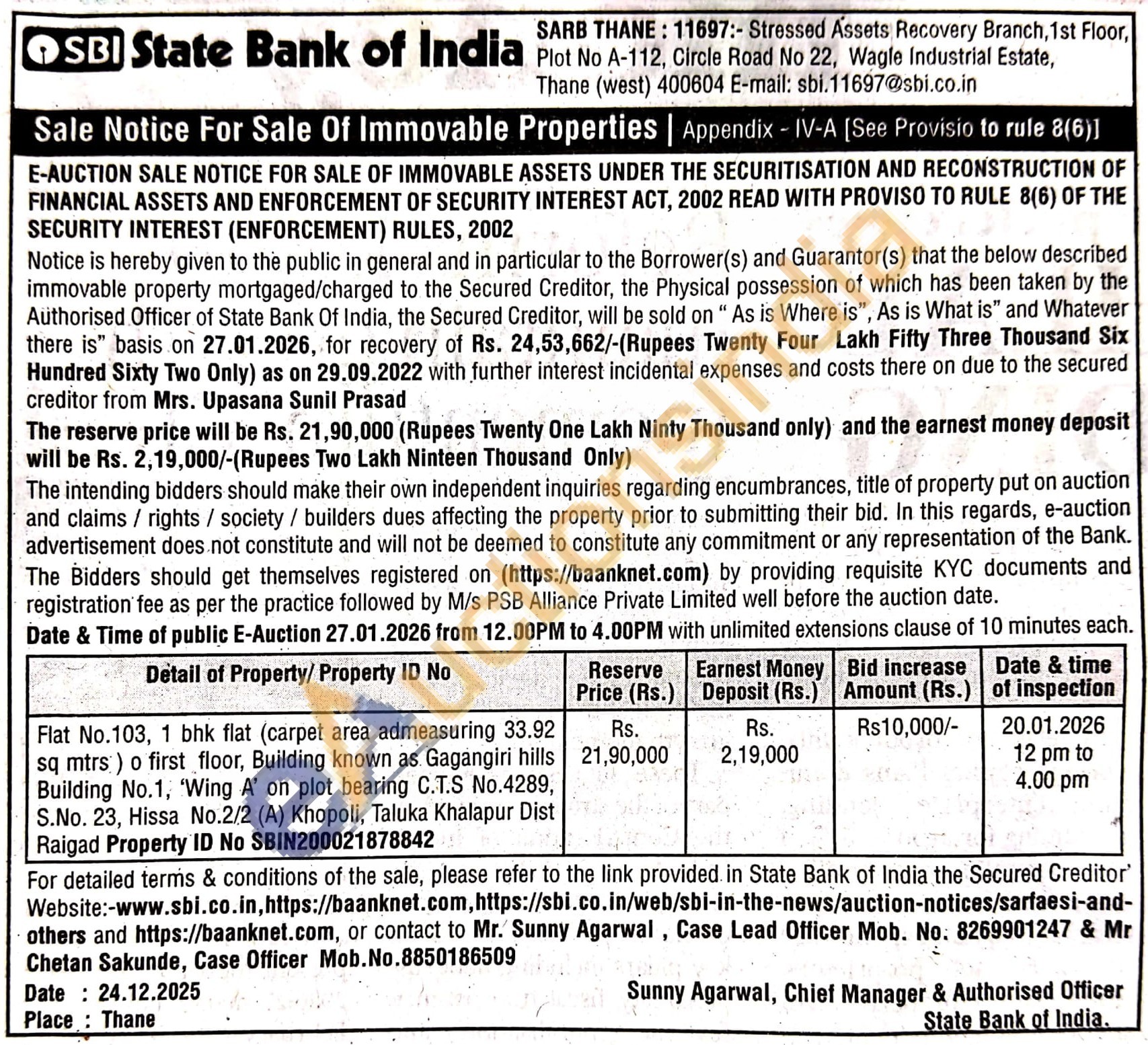 Flat No.103, 1 bhk flat (carpet area admeasuring 33.92 sq mtrs) o first floor, Building known as Gagangiri hills Building No.1, 'Wing A' on plot bearing C.T.S No.4289, S.No. 23, Hissa No.2/2 (A) Khopoli, Taluka Khalapur Dist Raigad Property ID No SBIN200021878842