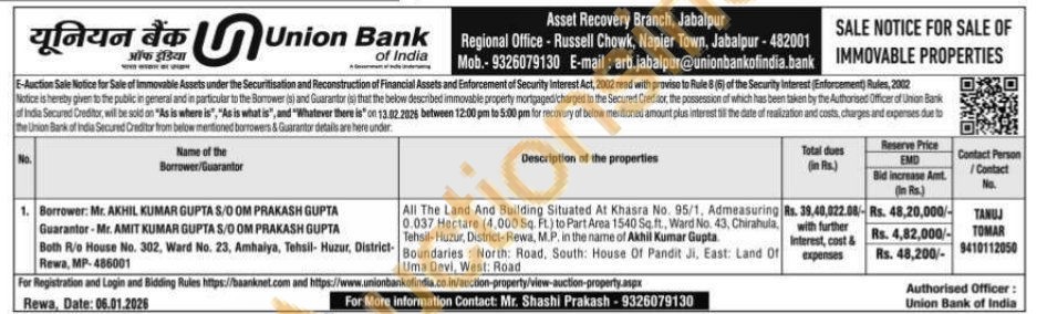 All The Land And Building Situated At Khasra No. 95/1, Admeasuring 0.037 Hectare (4,000 Sq. Ft) to Part Area 1540 Sq.ft., Ward No. 43, Chirahula, Tehsil-Huzur, District-Rewa, M.P. in the name of Akhil Kumar Gupta.Boundaries: North: Road, South: House Of Pandit Ji, East: Land Of Uma Devi, West: Road