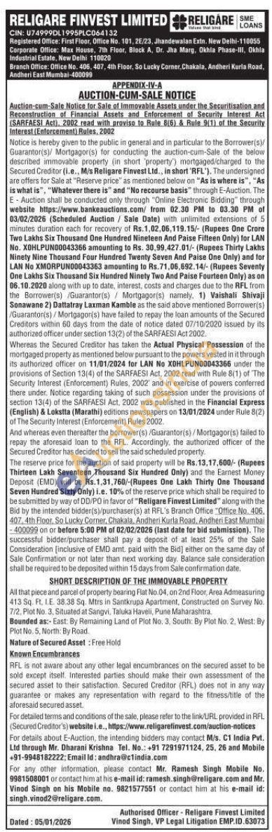 All that piece and parcel of property bearing Flat No.04, on 2nd Floor, Area Admeasuring 413 Sq Ft. LE. 38.38 Sq. Mtrs in Santkrupa Apartment, Constructed on Survey No. 7/2, Plot No. 3, Situated at Sangvi, Taluka Haveli, Pune Maharashtra Bounded as: East: By Remaining Land of Plot No. 3, South: By Plot No. 2, West: By Plot No. 5, North: By Road