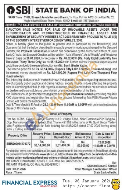 Flat No. 8-905, Gayatri Classic. Survey No. 9. Village Fene, Near Commissioner Bunglow Opp. Mansarovar Lake, Bhiwandi, Dist. Thane-421302 in the name of Mr. Sunil Jiledar Yadav vide Registered Agreement for Sale bearing No. 4135/2022 dated 27.07.2022 having area adm. 73.96 sq. mtr carpet area.