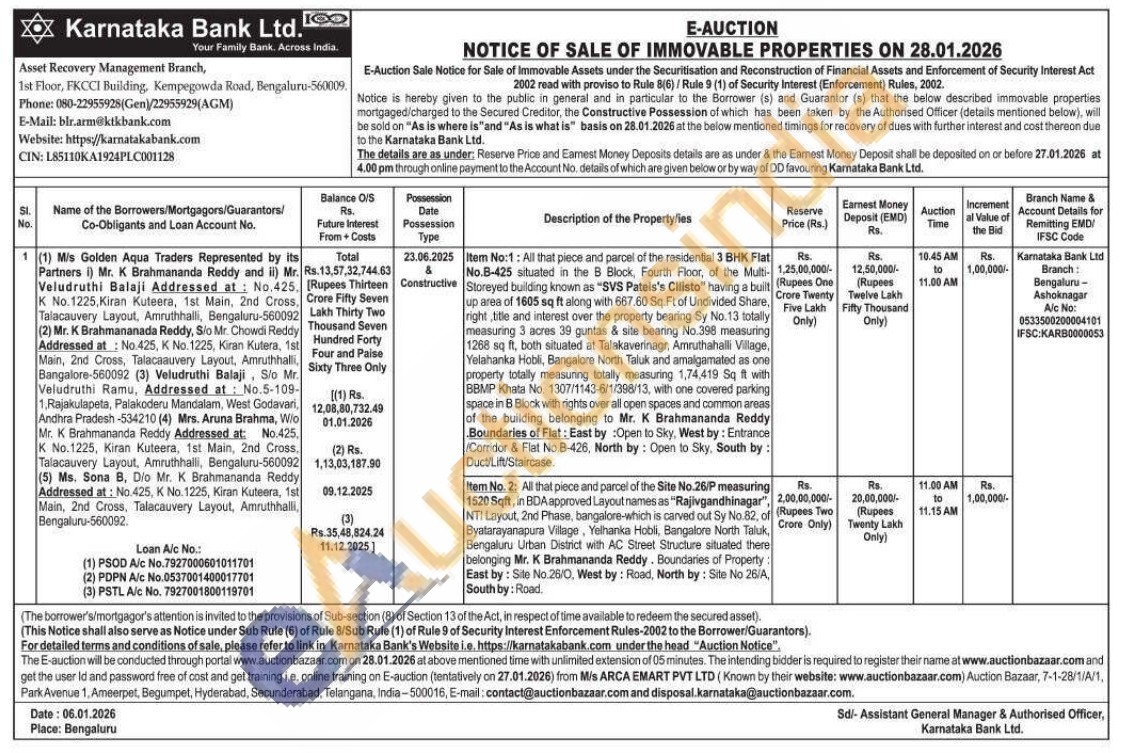 Item No:1: All that piece and parcel of the residential 3 BHK Flat No.B-425 situated in the B Block, Fourth Floor, of the Multi-Storeyed building known as "SVS Patels's Cilisto" having a built up area of 1605 sq ft along with 667.60 Sq. Ft of Undivided Share, right, title and interest over the property bearing Sy No.13 totally measuring 3 acres 39 guntas & site bearing No.398 measuring 1268 sq ft, both situated at Talakaverinagr, Amruthahalli Village, Yelahanka Hobli, Bangalore North Taluk and amalgamated as one property totally measuring totally measuring 1,74,419 Sq ft with BBMP Khata No. 1307/1143-6/1/398/13, with one covered parking space in B Block with rights over all open spaces and common areas of the building belonging to Mr. K Brahmananda Reddy Boundaries of Flat: East by Open to Sky, West by: Entrance Corridor & Flat No.B-426, North by: Open to Sky, South by: Duct/Lift/Staircase.
