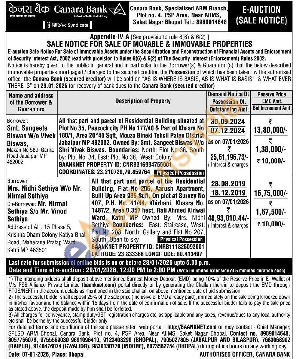 All that part and parcel of the Residential Building, Flat No 206, Aarush Apartment, Built Up Area 935 Sqft. On plot at Survey No 407, P.H. No. 41/44, Khirhani, Khasra No. 1487/2, Area 0.357 hect, Rafi Ahmed Kidwai Ward, Katni MP Owned By: Mrs. Nidhi Sethiya Boundaries: East: Staircase, West: Flat No 208, North: Gallery and Flat No 207, South: Open to skyBAANKNET PROPERTY ID: CNRB111825093001 LATITUDE: 23.833366 LONGITUDE: 80.413497