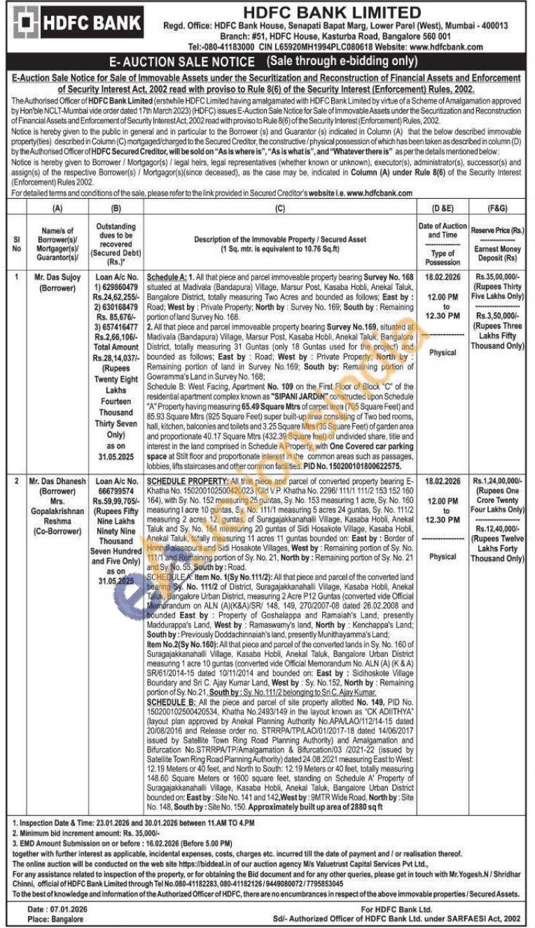 Schedule A: 1. All that piece and parcel immoveable property bearing Survey No. 168 situated at Madivala (Bandapura) Village, Marsur Post, Kasaba Hobli, Anekal Taluk, Bangalore District, totally measuring Two Acres and bounded as follows; East by: Road, West by: Private Property, North by Survey No. 169, South by: Remaining portion of land Survey No. 168. 2. All that piece and parcel immoveable property bearing Survey No. 169, situated at Madivala (Bandapura) Village, Marsur Post, Kasaba Hobli, Anekal Taluk, Bangalore District, totally measuring 31 Guntas (only 18 Guntas used for the project) and bounded as follows, East by Road, West by: Private Property, North by: Remaining portion of land in Survey No. 169. South by: Remaining portion of Gowramma's Land in Survey No. 168; Schedule B: West Facing, Apartment No. 109 on the First Floor of Block "C" of the residential apartment complex known as "SIPANI JARDIN" constructed upon Schedule "A" Property having measuring 65.49 Square Mtrs of carpet area (705 Square Feet) and 85.93 Square Mtrs (925 Square Feet) super built-up area consisting of Two bed rooms, hall, kitchen, balconies and toilets and 3.25 Square Mtrs (35 Square Feet) of garden area and proportionate 40.17 Square Mtrs (432.39 Square feet) of undivided share, title and interest in the land comprised in Schedule A Property, with One Covered car parking space at Stilt floor and proportionate interest in the common areas such as passages, lobbies, lifts staircases and other common facilities. PID No. 150200101800622575
