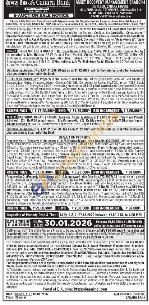 DETAILS OF PROPERTY: Property in the name of Mrs.Halima: All that piece and Parcel of Land situate at Sornambigai Nagar, Virugambakkam, Chennal-600 092, Comprised in Survey No. 70/2, as per TSLR Block No 23. T.S.No. 12, Survey No. 70/2A1 measuring an extent of 2841 Sq.ft of Vacant Land Corporation Division No.65 in No.104, Virugambakkam Village, Mambalam Taluk, Chennai District and being bounded on the North by: Door No.16. Old No. 29-A belonging to Mrs. Amarjothi together with 9.6 feet passage leading to 24 Feet Wide Road in Somambigai Nagar. South by:New Door No.14, Old No.7, belongs to Mr.S.Natarajan, East by: Vacant Land belonging to Mrs. Padmavathi Viswanathan, West by House No. 14 belonging to Late Swaminathan Krishnamoorthi. Admeasuring 2841 Sq.ft of Vacant Land and situated within Sub-registration District of Virugambakkam and the Registration District South Chennai.