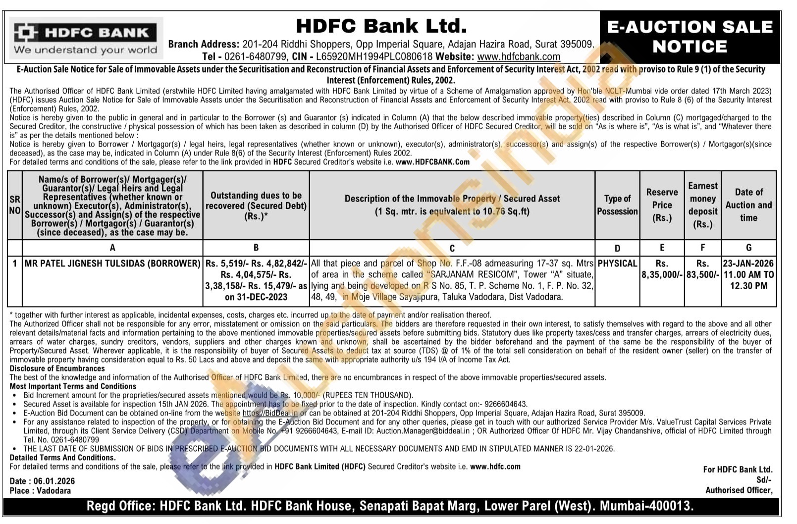 All that piece and parcel of Shop No. F.F.-08 admeasuring 17-37 sq. Mtrs of area in the scheme called "SARJANAM RESICOM", Tower "A" situate, lying and being developed on R S No. 85, T. P. Scheme No. 1, F. P. No. 32, 48, 49, in Moje Village Sayajipura, Taluka Vadodara, Dist Vadodara.