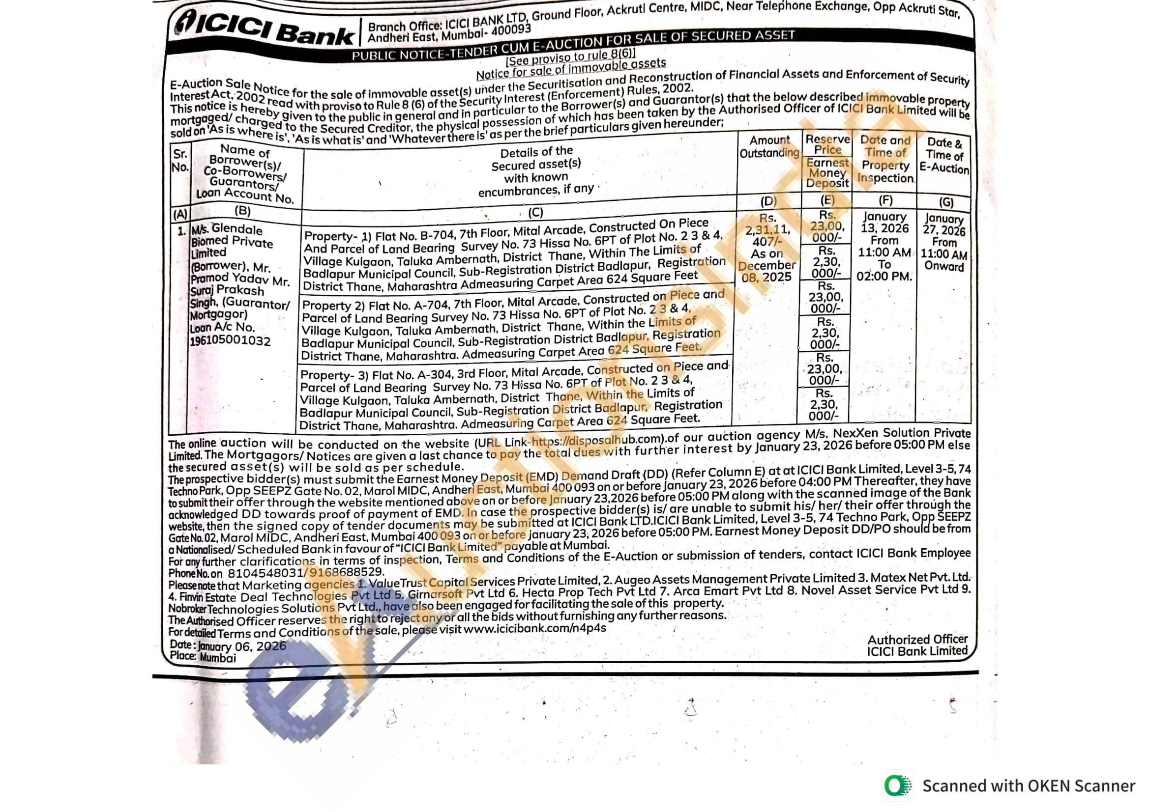 Property-2) Flat No. B-704, 7th Floor, Mital Arcade, Constructed On Piece And Parcel of Land Bearing Survey No. 73 Hissa No. 6PT of Plot No. 2 3 & 4, Village Kulgaon, Taluka Ambernath, District Thane, Within The Limits of Badlapur Municipal Council, Sub-Registration District Badlapur, Registration District Thane, Maharashtra Admeasuring Carpet Area 624 Square Feet
