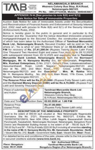 Land to the edent of 800.00 sq.ft situated at New Nelamangala Nagarasabe Gramalana Site No. 212/1, Khaneshumari No 850/212/1, E-Katha No. 150300700700120019, Near ADA Office. Lohith Nagara, Basavanahalli Grama Panchayath, Kasabahobli, Nelamangala Municipal, Nelamangala, Bangalore Rural District and Residential Building thereat to the extent of GF-780.00 Sq.ft. FF-760.00 Sq.ft and SF-700 Sq.ft totally 2220.00 Sq.ft including all amenities standing in the name of Mr. H. Narayana Murthy Sio. Mr. Hanumaiah. Boundaries: North Vacant Side No. 212, South Government Halla, East: Vacant Site, West: Road