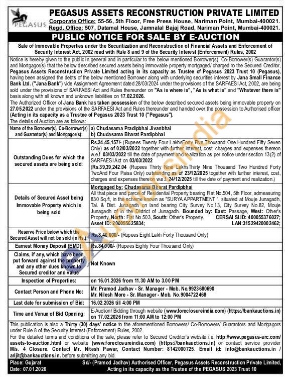 All that piece and parcel of Residential Property bearing Flat No.504, 5th Floor, admeasuring 830 Sq.ft, in the scheme known as "SURYA APPARTMENT", situated at Mouje Junagadh, Tal. & Dist. Junagadh on land bearing City Survey No.13, City Survey No.82, Mouje Junagadh of in the District of Junagadh. Bounded by: East: Passage, West: Other's Property, North: Flat No.503, South: Other's Property. Asset ID: 200055625834; CERSAI SI.ID: 400055376027; LAN