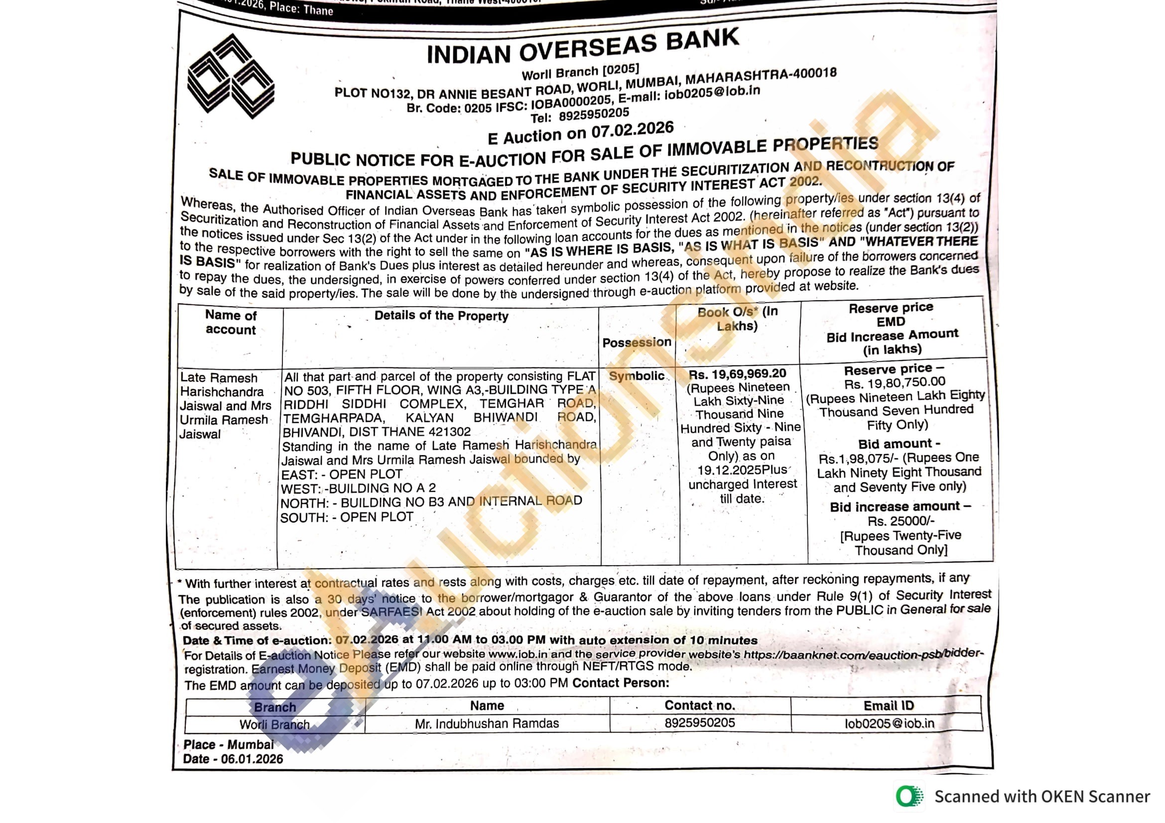 All that part and parcel of the property consisting FLAT NO 503, FIFTH FLOOR, WING A3, BUILDING TYPE A RIDDHI SIDDHI COMPLEX, TEMGHAR ROAD, TEMGHARPADA, KALYAN BHIWANDI BHIVANDI, DIST THANE 421302 ROAD Standing in the name of Late Ramesh Harishchandra Jaiswal and Mrs Urmila Ramesh Jaiswal bounded by EAST: OPEN PLOT WEST:-BUILDING NO A 2 NORTH: BUILDING NO B3 AND INTERNAL ROAD SOUTH:OPEN PLOT