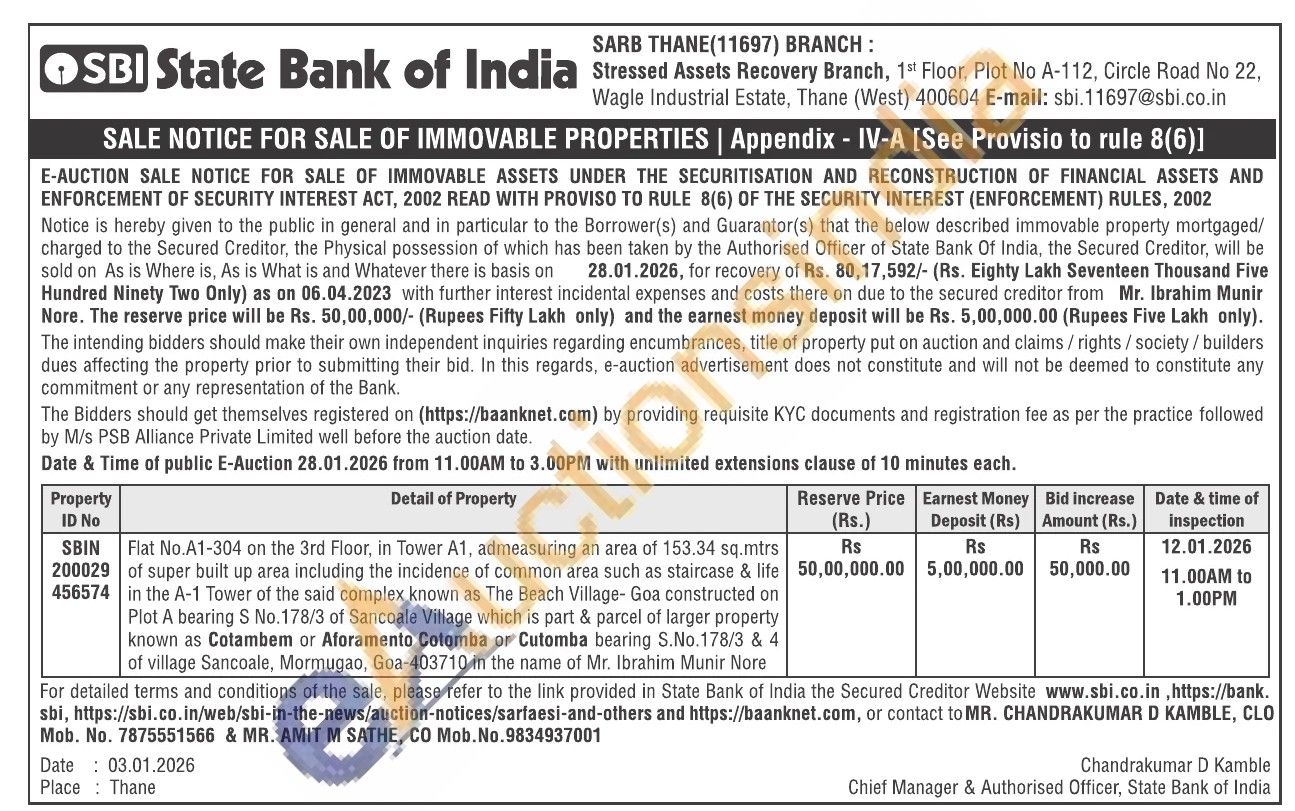 Flat No.A1-304 on the 3rd Floor, in Tower A1, admeasuring an area of 153.34 sq.mtrs of super built up area including the incidence of common area such as staircase & life in the A-1 Tower of the said complex known as The Beach Village- Goa constructed on Plot A bearing S No. 178/3 of Sancoale Village which is part & parcel of larger property known as Cotambem or Aforamento Cotomba or Cutomba bearing S.No.178/3 & 4 of village Sancoale, Mormugao, Goa-403710 in the name of Mr. Ibrahim Munir Nore