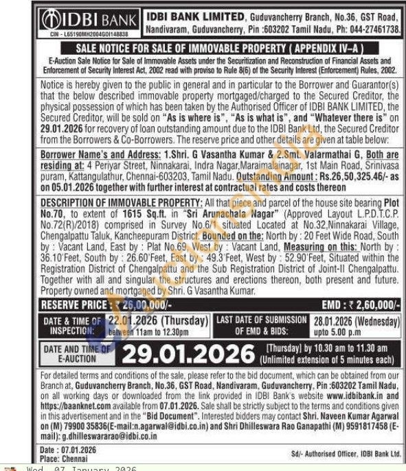 DESCRIPTION OF IMMOVABLE PROPERTY: All that piece and parcel of the house site bearing Plot No.70, to extent of 1615 Sq.ft. in "Sri Arunachala Nagar" (Approved Layout L.P.D.T.C.P. No.72(R)/2018) comprised in Survey No.6/1 situated Located at No.32, Ninnakarai Village, Chengalpattu Taluk, Kancheepuram District. Bounded on the: North by: 20 Feet Wide Road, South by: Vacant Land, East by: Plat No.69, West by: Vacant Land, Measuring on this: North by: 36.10 Feet, South by: 26.60'Feet, East by: 49.3 Feet, West by: 52.90'Feet, Situated within the Registration District of Chengalpattu and the Sub Registration District of Joint-II Chengalpattu. Together with all and singular the structures and erections thereon, both present and future. Property owned and mortgaged by Shri. G Vasantha Kumar.