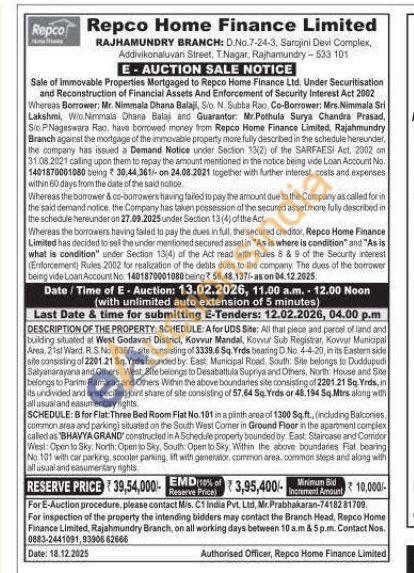 DESCRIPTION OF THE PROPERTY SCHEDULE: A for UDS Site: All that plece and parcel of land and building situated at West Godavari District, Kovvur Mandal, Kovvur Sub Registrar, Kovvur Municipal Area, 21st Ward RS No. 1638/7, site consisting of 3339.6 Sq. Yrds bearing D. No. 4-4-20, in its Eastern side side consisting of 2201.21 Sq. Yrds bounded by. East. Municipal Road, South: Site belongs to Duddupudi Satyanarayana and Others, West Site belongs to Desabattula Supriya and Others, North House and Site belongs to Parimi Ramaras and Others Within the above boundaries site consisting of 2201.21 Sq. Yrds, in its undivided and unspecified joint share of site consisting of 57.64 Sq. Yrds or 48.194 Sq.Mtrs along with all usual and easumentary rights SCHEDULE: B for Flat: Three Bed Room Flat No.101 in a plinth area of 1300 Sq.ft., (including Balconies, common area and parking) situated on the South Wirst Comer in Ground Floor in the apartment complex called as "BHAVYA GRAND constructed in A Schedule property bounded by East: Staircase and Comidor West: Open to Sky, North, Open to Sky, South: Open to Siky, Within the above boundaries Flat bearing No. 101 with car parking scooler parking, Ift with generator, common area, common steps and along with all usual and easumentary rights