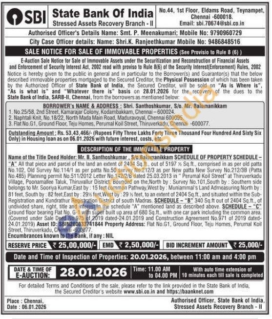 Name of the Title Deed Holder: Mr. B. Santhoshkumar, S/o.Balumanikkam SCHEDULE OF PROPERTY SCHEDULE- "A" All that piece and parcel of the land an extent of 2404 Sq.ft., out of 5197 Sq.ft., comprised in as per old patta No. 102, Old Survey No.114/1 as per patta No.50 survey No.212/3 as per New patta New Survey No.212/38 (Patta No.485) Planning permit No. 511/2012 Letter No.142/2/8 dated 25.03.2013 in Perumal Koil Street at Thiruverkadu Village, Poonamallee Taluk, Thiruvallur District. Bounded on the, North by: Survey No. 101, South by Southern side belongs to Mr. Sooriya Kumar, East by: 15 feet common Pathway, West by: Muniammal's Land Admeasuring North by: 81 feet, South by 82 feet, East by: 29% feet, West by: 29% feet, to an extent of 2404 Sq.ft., and situated within the Sub-Registration and Kundrathur Registration District of south Madras, SCHEDULE-"B" 340 Sq.ft out of 2404 Sq.ft., of undivided share, right, title and interest in the schedule "A" mentioned land as described above. SCHEDULE - "C" Ground floor bearing Flat No. G-1 with super built up area of 680 Sq. ft., with one car park including the common area. (Covered under Sale Deed No.975 of 2019 dated-24.01.2019 and Construction Agreement No.971 of 2019 dated-24.01.2019) Asset ID: SBIN200033741844 Property Address: Flat No.G1, Ground Floor, Teju Homes, Perumal Keil Street, Thiruverkadu, Chennai-600077