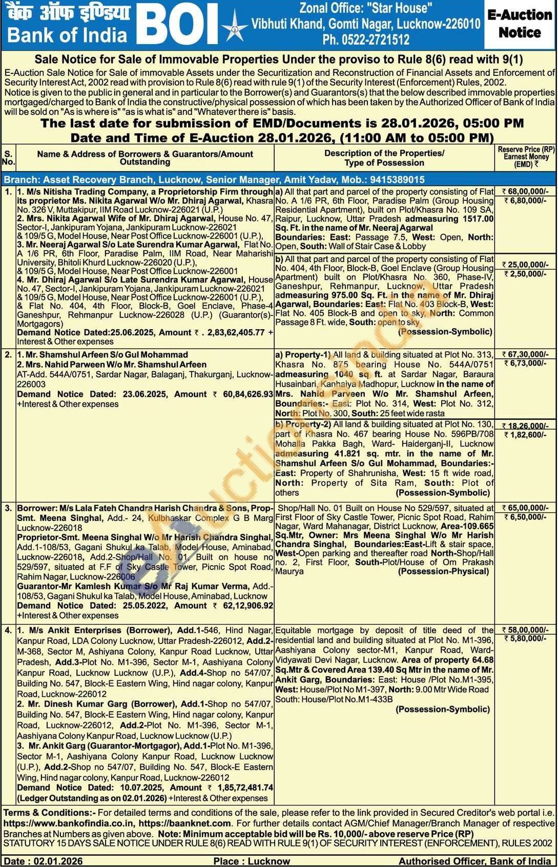 Equitable mortgage by deposit of title deed of the residential land and building situated at Plot No. M1-396 Aashiyana Colony sector-M1, Kanpur Road, Ward Vidyawati Devi Nagar, Lucknow. Area of property 64.68 Sq.Mtr & Covered Area 139.40 Sq Mtr in the name of Mr Ankit Garg, Boundaries: East: House /Plot No.M1-395 West: House/Plot No M1-397, North: 9.00 Mtr Wide Road South: House/Plot No.M1-433B