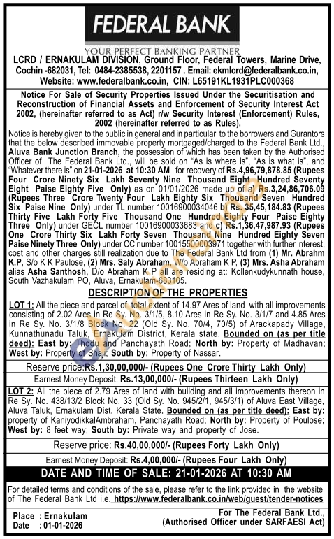 LOT 1: All the piece and parcel of total extent of 14.97 Ares of land with all improvements consisting of 2.02 Ares in Re Sy. No. 3/1/5, 8.10 Ares in Re Sy. No. 3/1/7 and 4.85 Ares in Re Sy. No. 3/1/8 Block No. 22 (Old Sy. No. 70/4, 70/5) of Arackapady Village, Kunnathunadu Taluk, Ernakulam District, Kerala state. Bounded on (as per title deed): East by: Thodu and Panchayath Road; North by: Property of Madhavan; West by: Property of Shaji; South by: Property of Nassar.