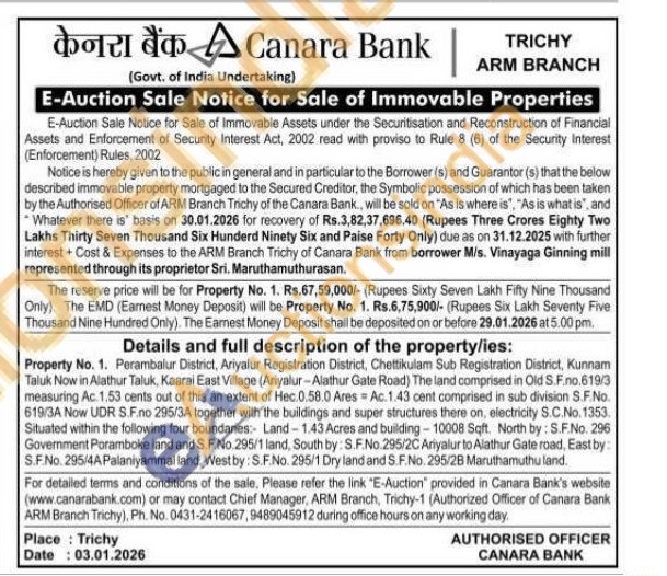Perambalur District, Ariyalur Registration District, Chettikulam Sub Registration District, Kunnam Taluk Now in Alathur Taluk, Kaarai East Village (Ariyalur-Alathur Gate Road) The land comprised in Old S.F.no.619/3 measuring Ac.1.53 cents out of this an extent of Hec.0.598.0 Ares Ac.1.43 cent comprised in sub division S.F.No. 619/3A Now UDR S.F.no 295/3A together with the buildings and super structures there on, electricity S.C.No. 1353. Situated within the following four boundaries: Land-1.43 Acres and building-10008 Sqft. North by: S.F.No. 296 Govemment Poramboke land and S.F.No. 295/1 land. South by: S.F.No 295/2C Ariyalur to Alathur Gate road, Eastby S.F.No. 295/4A Palaniyammal land, West by: S.F.No. 295/1 Dry land and S. F.No. 295/28 Maruthamuthu land.