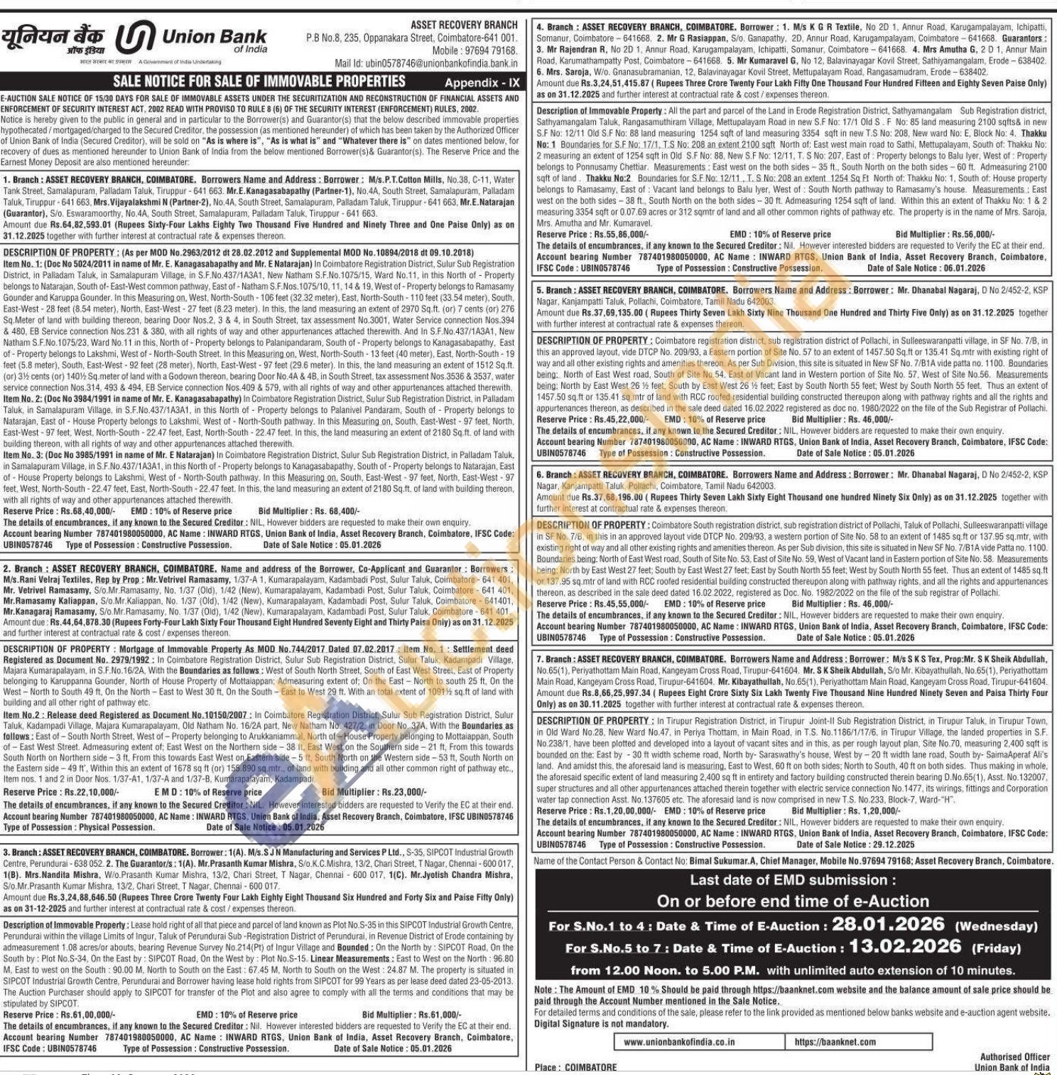 7) In Tirupur Registration District, in Tirupur Joint-II Sub Registration District, in Tirupur Taluk, in Tirupur Town, in Old Ward No.28. New Ward No.47, in Periya Thottam, in Main Road, in T.S. No.1186/1/17/6, in Tirupur Village, the landed properties in S.F. No.238/1, have been plotted and developed into a layout of vacant sites and in this, as per rough layout plan, Site No.70, measuring 2.400 sqft is bounded on the: East by -30 ft width scheme road, North by- Saraswathy's house, West by-20 ft width lane road, South by- SaimaAperaf Ali's land. And amidst this, the aforesaid land is measuring. East to West, 60 ft on both sides; North to South, 40 ft on both sides. Thus making in whole, the aforesaid specific extent of land measuring 2,400 sq ft in entirety and factory building constructed therein bearing D.No.65(1), Asst. No. 132007, super structures and all other appurtenances attached therein together with electric service connection No. 1477, its wirings, fittings and Corporation water tap connection Asst. No. 137605 etc. The aforesaid land is now comprised in new T.S. No.233, Block-7, Ward-"H"