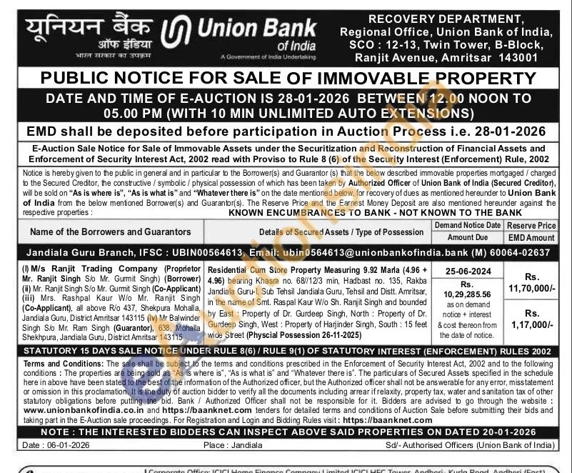 Residential Cum Store Property Measuring 9.92 Marla (4.96 + 4.96) bearing Khasra no. 68//12/3 min, Hadbast no. 135, Rakba Jandiala Guru-l, Sub Tehsil Jandiala Guru, Tehsil and Distt. Amritsar, in the name of Smt. Raspal Kaur W/o Sh. Ranjit Singh and bounded by East Property of Dr. Gurdeep Singh, North: Property of Dr. Gurdeep Singh, West: Property of Harjinder Singh, South: 15 feet wide Street (Physcial Possession 26-11-2025)