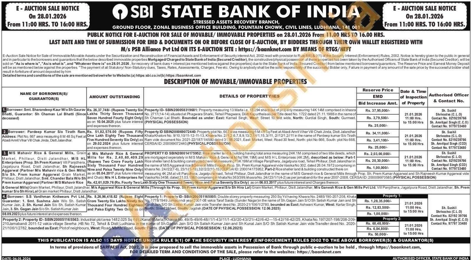 Property 2: Property ID- 2: Property ID-SBIN200051165563: Industrial plotarea 1482.025 So Yd (2Kanal 9Maria) Khasra No. 49/15-4976-48//1/1-43/11/1-43/20-43/21/-426-42-15-420/16-42//25. Khata No. 197/207-198/208-209-210Jamabandi 2011-12 vakia village Seerha, HB No 72, Tehsil & Distt Ludhiana in the name of Sh. Gagan Jain S/O Sh Satish Kumar Jain and Sh Kunal Jain S/O Sh Satish Kumar Jain vide Transfer deed No. 2020-21/106/1/2782, bounded as East: Plot of neighbours. West: Road, North: Road South: Fields.