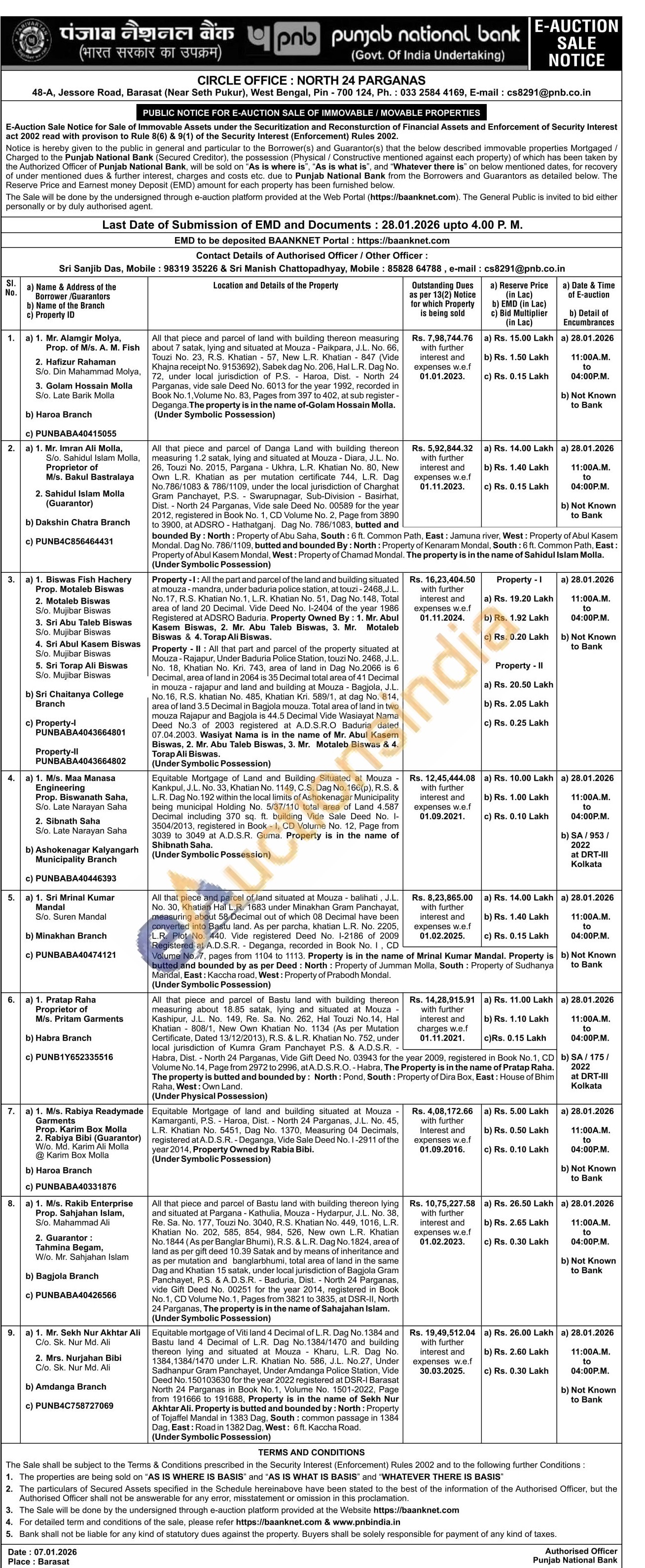 Property II: All that part and parcel of the property situated at Mouza - Rajapur, Under Baduria Police Station, touzi No. 2468, J.L. No. 18, Khatian No. Kri. 743, area of land in Dag No.2066 is 6 Decimal, area of land in 2064 is 35 Decimal total area of 41 Decimal in mouza rajapur and land and building at Mouza Bagjola, J.L. No.16, R.S. khatian No. 485, Khatian Kri. 589/1, at dag No. 814, area of land 3.5 Decimal in Bagjola mouza. Total area of land in two mouza Rajapur and Bagjola is 44.5 Decimal Vide Wasiayat Nama Deed No.3 of 2003 registered at A.D.S.R.O Baduria dated 07.04.2003. Wasiyat Nama is in the name of Mr. Abul Kasem Biswas, 2. Mr. Abu Taleb Biswas, 3. Mr. Motaleb Biswas & 4. Torap Ali Biswas. (Under Symbolic Possession)