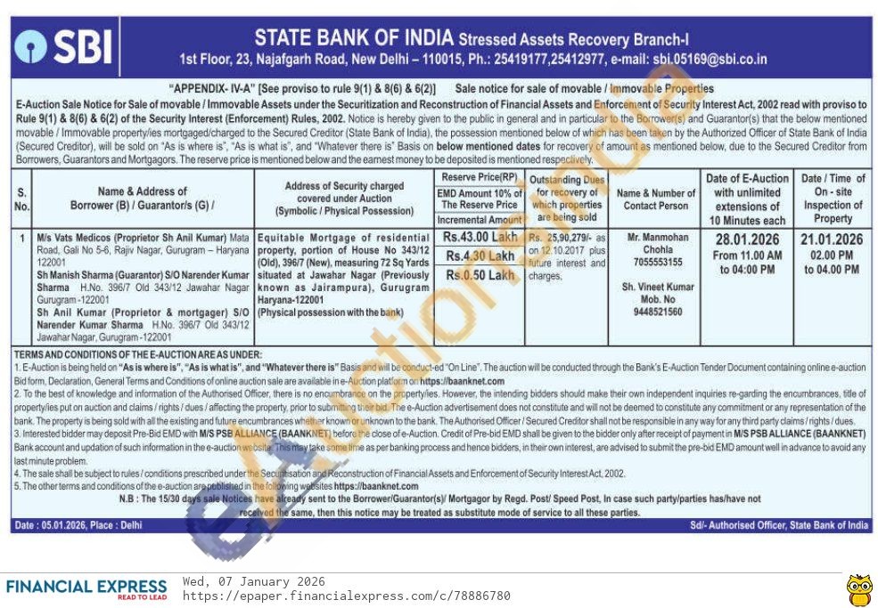 Equitable Mortgage of residential property, portion of House No 343/12 (Old), 396/7 (New), measuring 72 Sq Yards situated at Jawahar Nagar (Previously known as Jairampura), Gurugram Haryana-122001 (Physical possession with the bank)