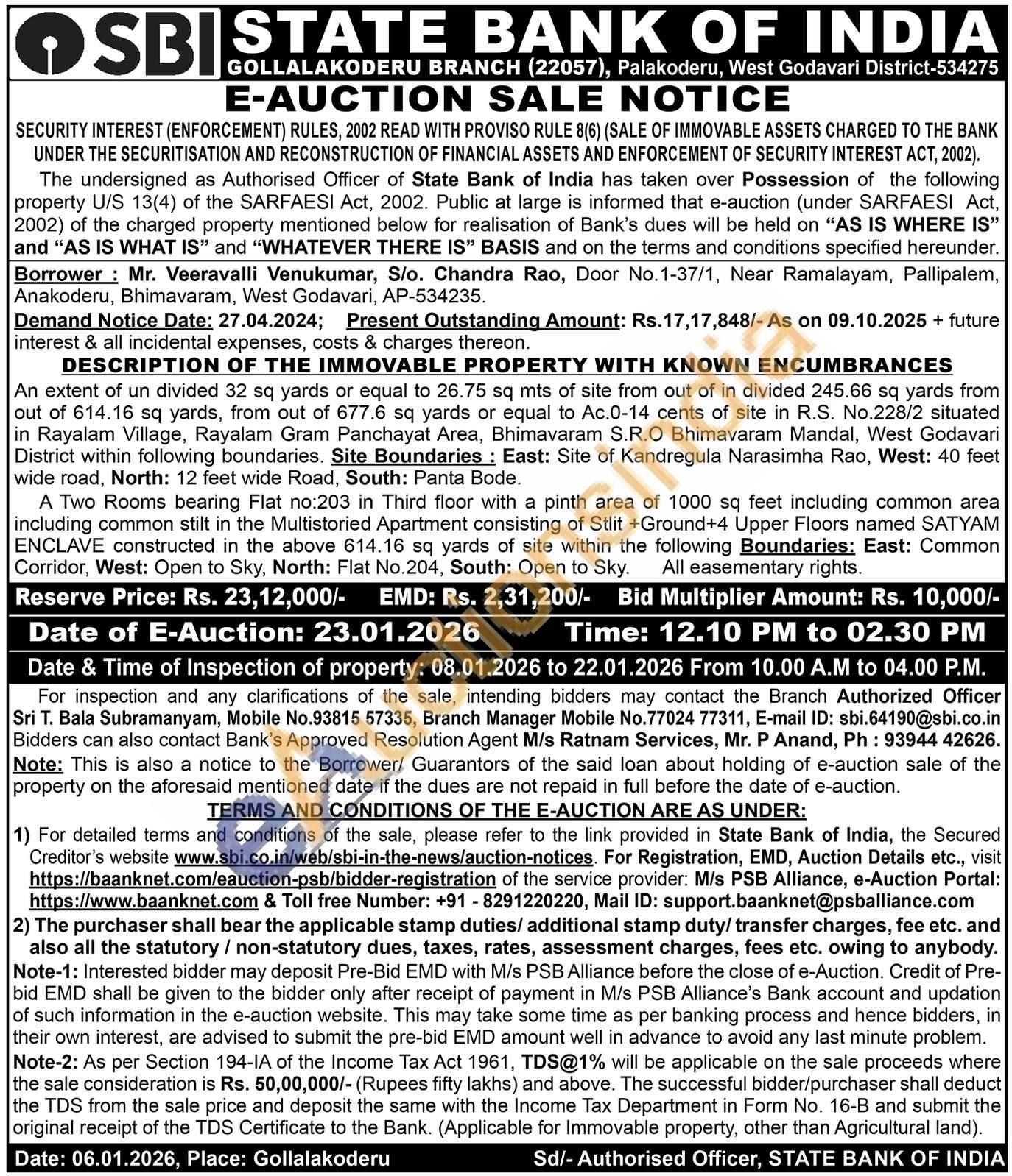An extent of un divided 32 sq yards or equal to 26.75 sq mts of site from out of in divided 245.66 sq yards from out of 614.16 sq yards, from out of 677.6 sq yards or equal to Ac.0-14 cents of site in R.S. No.228/2 situated in Rayalam Village, Rayalam Gram Panchayat Area, Bhimavaram S.R.O Bhimavaram Mandal, West Godavari District within following boundaries. Site Boundaries: East: Site of Kandregula Narasimha Rao, West: 40 feet wide road, North: 12 feet wide Road, South: Panta Bode. A Two Rooms bearing Flat no:203 in Third floor with a pinth area of 1000 sq feet including common area including common stilt in the Multistoried Apartment consisting of Stlit +Ground+4 Upper Floors named SATYAM ENCLAVE constructed in the above 614.16 sq yards of site within the following Boundaries: East: Common Corridor, West: Open to Sky, North: Flat No.204, South: Open to Sky. All easementary rights.