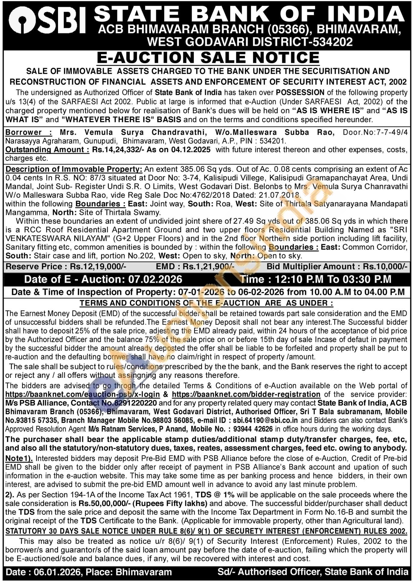 Description of Immovable Property: An extent 385.06 Sq yds. Out of Ac. 0.08 cents comprising an extent of Ac 0.04 cents In R.S. NO: 87/3 situated at Door No: 3-74, Kalisipudi Villege, Kalisipudi Gramapanchayat Area, Undi Mandal, Joint Sub- Register Undi S.R. O Limits, West Godavari Dist. Belonbs to Mrs. Vemula Surya Chanravathi W/o Malleswara Subba Rao, vide Reg Sale Doc No:4762/2018 Dated: 21.07.2018. within the following Boundaries: East: Joint way, South: Roa, West: Site of Thirtala Satyanarayana Mandapati Mangamma, North: Site of Thirtala Swamy
