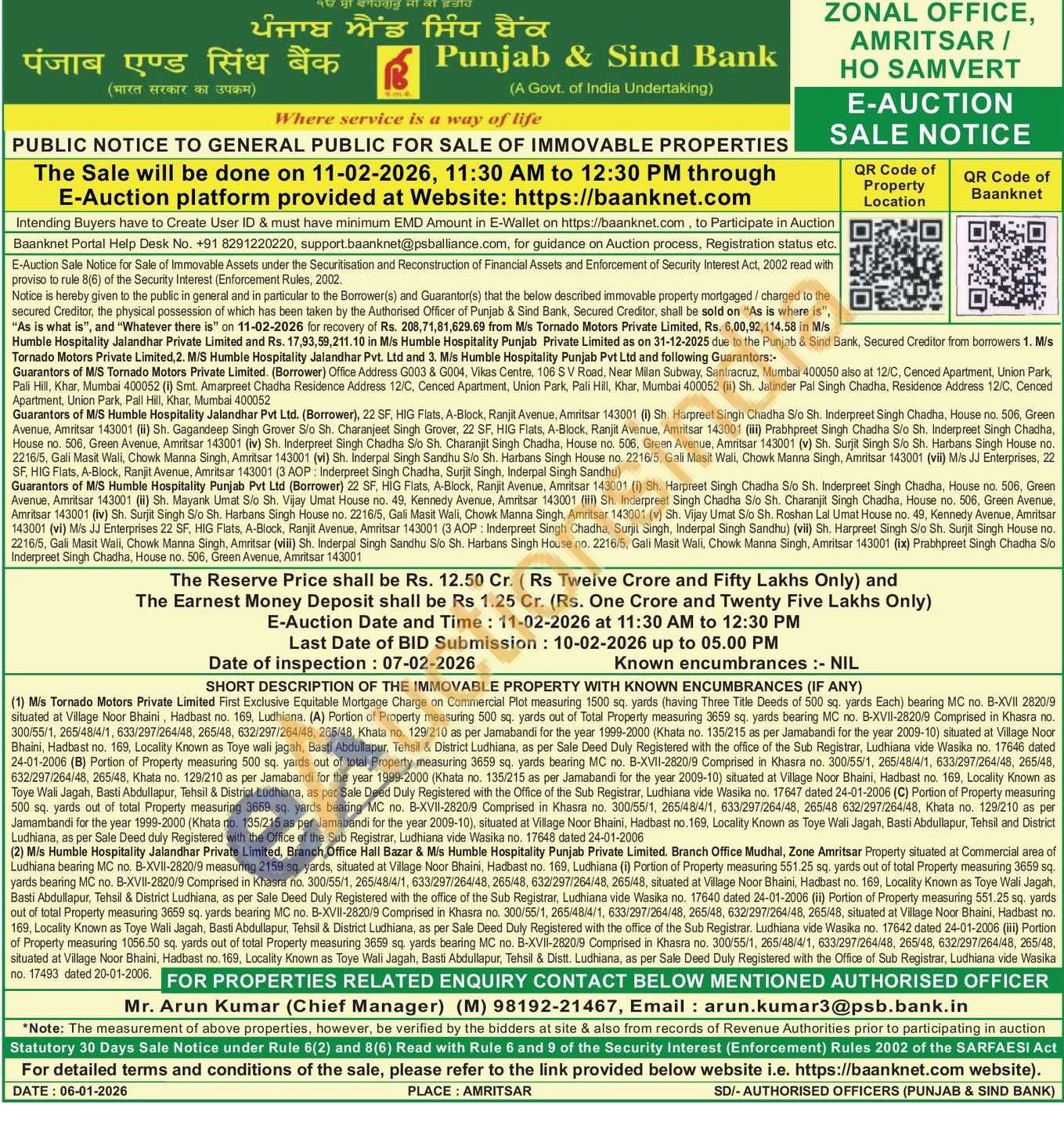 (1) M/s Tornado Motors Private Limited First Exclusive Equitable Mortgage Charge on Commercial Plot measuring 1500 sq. yards (having Three Title Deeds of 500 sq. yards Each) bearing MC no. B-XVII 2820/9 situated at Village Noor Bhaini, Hadbast no. 169, Ludhiana. (A) Portion of Property measuring 500 sq. yards out of Total Property measuring 3659 sq. yards bearing MC no. B-XVII-2820/9 Comprised in Khasra no. 300/55/1, 265/48/4/1, 633/297/264/48, 265/48, 632/297/264/48, 265/48, Khata no. 129/210 as per Jamabandi for the year 1999-2000 (Khata no. 135/215 as per Jamabandi for the year 2009-10) situated at Village Noor Bhaini. Hadbast no. 169, Locality Known as Toye wali jagah, Basti Abdullapur, Tehsil & District Ludhiana, as per Sale Deed Duly Registered with the office of the Sub Registrar, Ludhiana vide Wasika no. 17646 dated 24-01-2006 (B) Portion of Property measuring 500 sq yards out of total Property measuring 3659 sq, yards bearing MC no. B-XVII-2820/9 Comprised in Khasra no. 300/55/1, 265/48/4/1, 633/297/264/48, 265/48, 632/297/264/48, 265/48, Khata no. 129/210 as per Jamabandi for the year 1999-2000 (Khata no. 135/215 as per Jamabandi for the year 2009-10) situated at Village Noor Bhaini, Hadbast no. 169, Locality Known as Toye Wali Jagah, Basti Abdullapur, Tehsil & District Ludhiana, as per Sale Deed Duly Registered with the Office of the Sub Registrar, Ludhiana vide Wasika no. 17647 dated 24-01-2006 (C) Portion of Property measuring 500 sq. yards out of total Property measuring 3659 sq. yards bearing MC no. B-XVII-2820/9 Comprised in Khasra no. 300/55/1, 265/48/4/1, 633/297/264/48, 265/48 632/297/264/48, Khata no. 129/210 as per Jamambandi for the year 1999-2000 (Khata no. 135/215 as per Jamabandi for the year 2009-10), situated at Village Noor Bhaini, Hadbast no. 169, Locality Known as Toye Wali Jagah, Basti Abdullapur, Tehsil and District Ludhiana, as per Sale Deed duly Registered with the Office of the Sub Registrar, Ludhiana vide Wasika no. 17648 dated 24-01-2006 (2) M/s Humble Hospitality Jalandhar Private Limited, Branch Office Hali Bazar & M/s Humble Hospitality Punjab Private Limited. Branch Office Mudhal, Zone Amritsar Property situated at Commercial area of Ludhiana bearing MC no. B-XVII-2820/9 measuring 2159 sq, yards, situated at Village Noor Bhaini, Hadbast no. 169, Ludhiana (i) Portion of Property measuring 551.25 sq. yards out of total Property measuring 3659 sq. yards bearing MC no. B-XVII-2820/9 Comprised in Khasra no. 300/55/1, 265/48/4/1, 633/297/264/48, 265/48, 632/297/264/48, 265/48, situated at Village Noor Bhaini, Hadbast no. 169, Locality Known as Toye Wali Jagah, Basti Abdullapur, Tehsil & District Ludhiana, as per Sale Deed Duly Registered with the office of the Sub Registrar, Ludhiana vide Wasika no. 17640 dated 24-01-2006 (ii) Portion of Property measuring 551.25 sq. yards out of total Property measuring 3659 sq. yards bearing MC no. B-XVII-2820/9 Comprised in Khasra no. 300/55/1, 265/48/4/1, 633/297/264/48, 265/48, 632/297/264/48, 265/48, situated at Village Noor Bhaini, Hadbast no. 169, Locality Known as Toye Wali Jagah, Basti Abdullapur, Tehsil & District Ludhiana, as per Sale Deed Duly Registered with the office of the Sub Registrar. Ludhiana vide Wasika no. 17642 dated 24-01-2006 (iii) Portion of Property measuring 1056.50 sq yards out of total Property measuring 3659 sq yards bearing MC no. B-XVII-2820/9 Comprised in Khasra no. 300/55/1, 265/48/4/1, 633/297/264/48, 265/48, 632/297/264/48, 265/48, situated at Village Noor Bhaini, Hadbast no. 169, Locality Known as Toye Wali Jagah, Basti Abdullapur, Tehsil & Distt. Ludhiana, as per Sale Deed Duly Registered with the Office of Sub Registrar, Ludhiana vide Wasika no. 17493 dated 20-01-2006