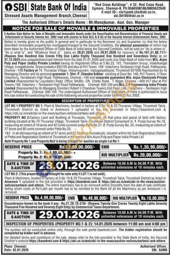 LOT NO 1:PROPERTY NO 1: Plant & Machinery, located in factory at S.No 19 & 20 Thuvarasi Village, Tirunelveli Taluk, Tirunelveli District as listed in Annexure 1 uploaded in the link provided in https://baanknet.com & https://sbi.co.in/web/sbi-in-the-news/auction-notices/sarfaesi-and-others.