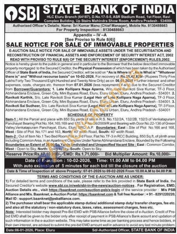 Item-1: All the Parcel and piece with 850 Sq yards of site in R.S. No. 132/2A, 132/2B, 132/3 of Venkatapuram Panchayat Bearing Plot No. 164, 165, 169 and 170, LP No. 26/2009/R and Bearing with Door No.22-136 of Green Valley, Venkatapuram Panchayat, Eluru, Eluru SRO, A.P Boundaries: East: Site of Plot No. 166 and 168, West: Site of Plot No.171 and 163, North: 40' width Road, South: 40' width Road. Item-2: Out of Item No. 1 Two Bed Room Flat in 3rd Floor, Flat No. TF-3 in RCC Building, 850 Sq.ft, of plinth area including Common Area, in an Apartment Complex Under Name Abhinandana Enclave, Bounded by the Following Boundaries an Extent of 36.00 Sq. Yards Undivided and Unspecified Vacant Site: East: Common Corridor, West: Open to Sky, North: Open to Sky, South: Open to Sky