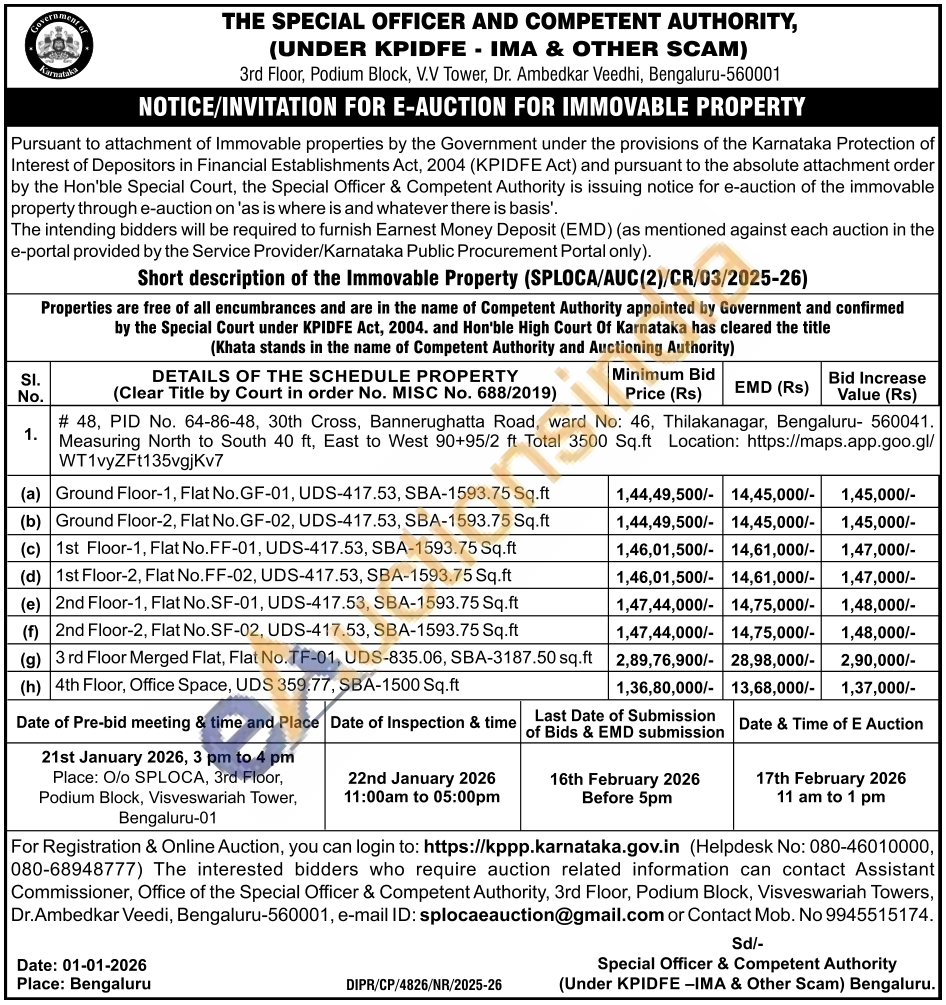 DETAILS OF THE SCHEDULE PROPERTY (Clear Title by Court in order No. MISC No. 688/2019) : # 48, PID No. 64-86-48, 30th Cross, Bannerughatta Road, ward No: 46, Thilakanagar, Bengaluru- 560041. Measuring North to South 40 ft, East to West 90+95/2 ft Total 3500 Sq.ft Location: https://maps.app.goo.gl/WT1vyZFt135vgjKv7