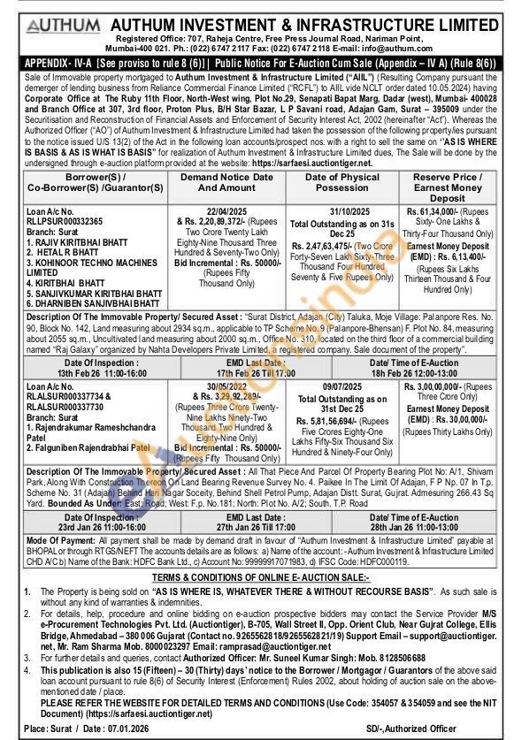 Description Of The Immovable Property/ Secured Asset: "Surat District, Adajan (City) Taluka, Moje Village: Palanpore Res. No. 90, Block No. 142, Land measuring about 2934 sq.m., applicable to TP Scheme No. 9 (Palanpore-Bhensan) F. Plot No. 84, measuring about 2055 sq.m., Uncultivated land measuring about 2000 sq.m., Office No. 310, located on the third floor of a commercial building named "Raj Galaxy" organized by Nahta Developers Private Limited, a registered company. Sale document of the property".