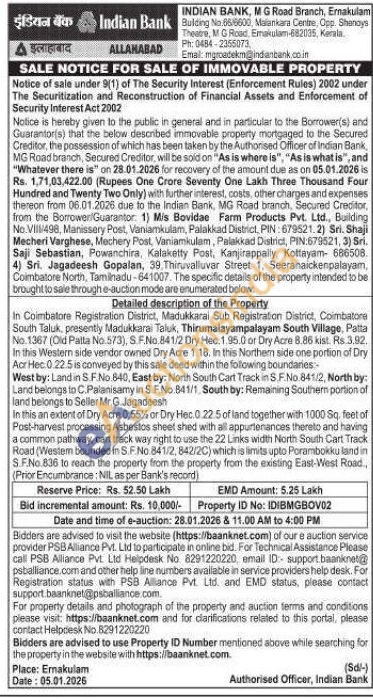 In Coimbatore Registration District, Madukkarai Sub Registration District, Coimbatore South Taluk, presently Madukkarai Taluk, Thirumalayampalayam South Village, Patta No. 1367 (Old Palta No. 573), S.F.No.841/2 Dry Hec. 1.95.0 or Dry Acre 8.86 kist. Rs.3.92. In this Western side vendor owned Dry Acre 1.18. In this Northem side one portion of Dry Aor Hec. 0.22.5 is conveyed by this sale deed within the following boundaries:- West by: Land in S. F.No. 840, East by: North South Cart Track in S.F.No. 841/2, North by: Land belongs to C.Palanisamy in S.F.No. 841/1, South by: Remaining Southem portion of land belongs to Seller Mr. G. Jagadeesh In this an extent of Dry Acre 0.55% or Dry Hec 0.22.5 of land together with 1000 Sq. feet of Post-harvest processing Asbestos sheet shed with all appurtenances thereto and having a common pathway, cart track way right to use the 22 Links width North South Cart Track Road (Westem bounded in S.F.No.841/2, 842/20) which is limits upto Porambokku land in S.F.No.836 to reach the property from the property from the existing East-West Road