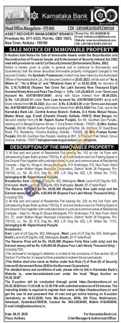2) All that part and parcel of Residential Flat bearing No. 202 on the 2nd Floor with admeasuring Super Build up Area 1783 Sq. ft. and one medium size Car Parking Space in the Ground Floor together with undivided share in Land and common areas at Residential Complex-Deja Vu, Wings B, Mouza Mohisgote, P.O. Krishnapur, P.S. New Town. Ward No. 27, under Bidhan Nagar Municipal Corporation, District North 24 Parganas, Pin-700102. J.L. No. 20, R.S. Dag No. 868, L.R. Dag No. 922, L.R. Khitian No. 117/2, belonging to Mr. Rajesh Kumar Punjabi. Boundaries: East: Land of LR Dag No. 922, Mahisgote, West: Land of LR Dag No. 923, Mahisgote, North: Land of LR Dag No. 926, Mahiscote, South: 20-0" wide Road