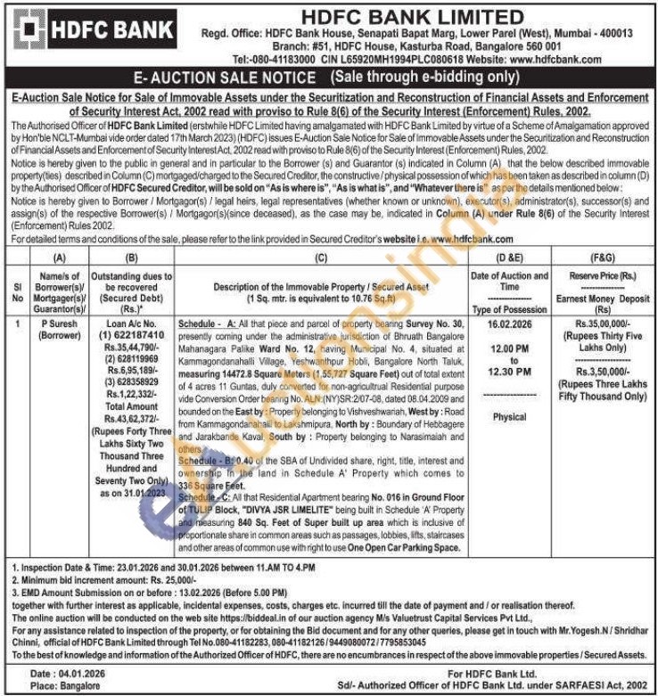 Schedule A: All that piece and parcel of property bearing Survey No. 30, presently coming under the administrative jurisdiction of Bhruath Bangalore Mahanagara Palike Ward No. 12, having Municipal No. 4, situated at Kammagondanahalli Village, Yeshwanthpur Hobli, Bangalore North Taluk, measuring 14472.8 Square Meters (1,55,727 Square Feet) out of total extent of 4 acres 11 Guntas, duly converted for non-agricultrual Residential purpose vide Conversion Order bearing No. ALN:(NY)SR:2/07-08, dated 08.04.2009 and bounded on the East by: Property belonging to Vishveshwariah, West by: Road from Kammagondanahalli to Lakshmipura. North by: Boundary of Hebbagere and Jarakbande Kaval, South by: Property belonging to Narasimaiah and others