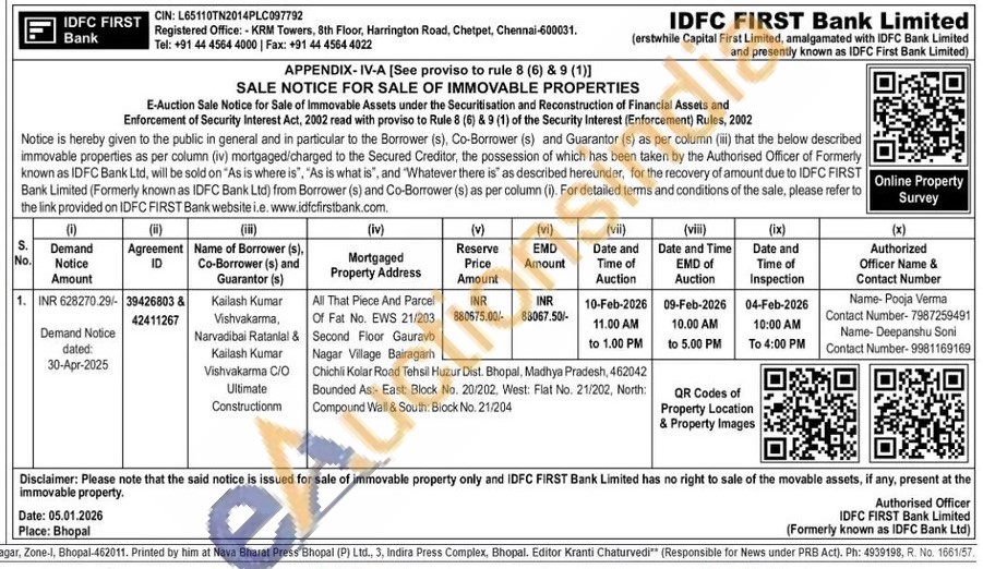 All That Piece And Parcel Of Fat No. EWS 21/203 Second Floor Gauravb Nagar Village Bairagarh Chichli Kolar Road Tehsil Huzur Dist. Bhopal, Madhya Pradesh, 462042 Bounded As:- East: Block No. 20/202, West: Flat No. 21/202, North: Compound Wall & South: Block No. 21/204
