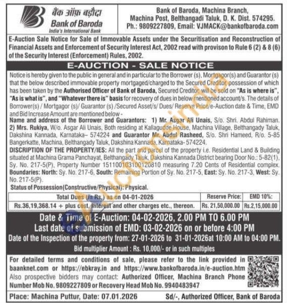 DISCRIPTION OF THE PROPERTY/IES: All the part and parcel of the property ie. Residential Land & Building situated at Machina Grama Panchayat, Belthangady Taluk, Dakshina Kannada District bearing Door No.: 5-82(1). Sy. No. 217-5(P), Property Number 151100103100120810 measuring 7.20 Cents of Residential complex Boundaries: North: Sy. No. 217-6, South: Remaining Portion of Sy. No. 217-5, East: Sy. No. 217-3, West: Sy. No. 217-5(P).