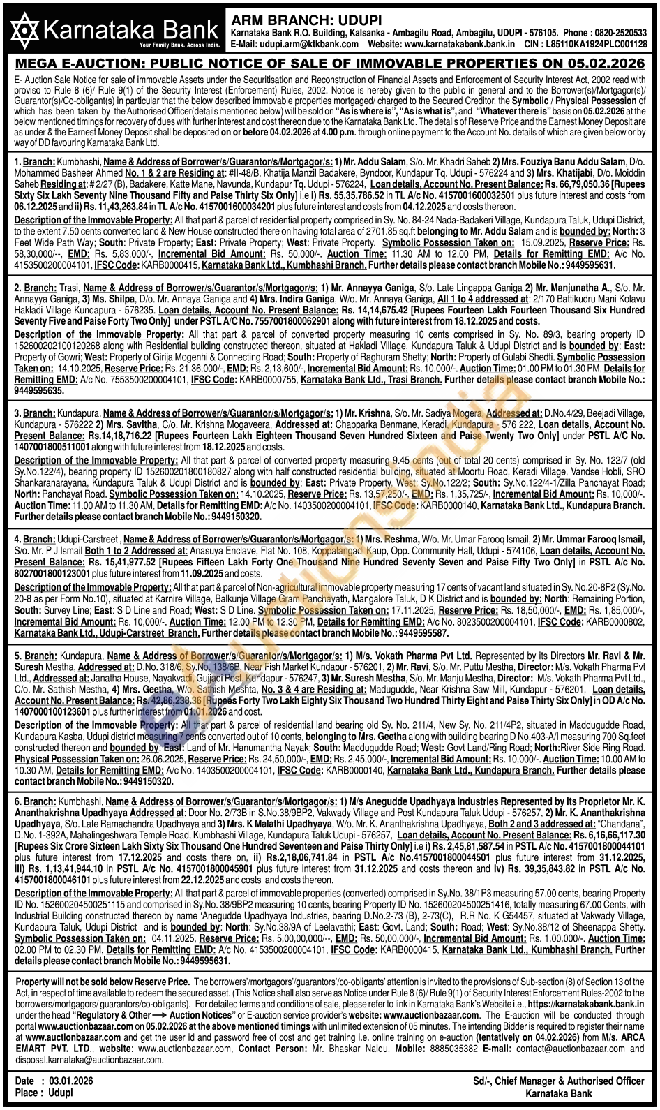 Description of the Immovable Property: All that part & parcel of converted property measuring 10 cents comprised in Sy. No. 89/3, bearing property ID 152600202100120268 along with Residential building constructed thereon, situated at Hakladi Village, Kundapura Taluk & Udupi District and is bounded by: East: Property of Gowri; West: Property of Girija Mogenhi & Connecting Road; South: Property of Raghuram Shetty; North: Property of Gulabi Shedti