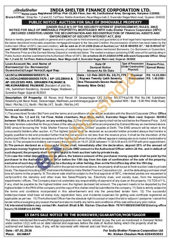 Description Of Property: All Pieces And Parcel Of Joravamagar City Survey No.3774/a/146 Plot No.146 Sukhdham Residency, lati Bazar Road, Joravarnagar, Wadhwan, surendranagar, gujarat-363020 Bounded With: East: 9.00 Mtrs Wide Road, West: Plot No. 111, North: Plot No. 147, South: Plot No. 145