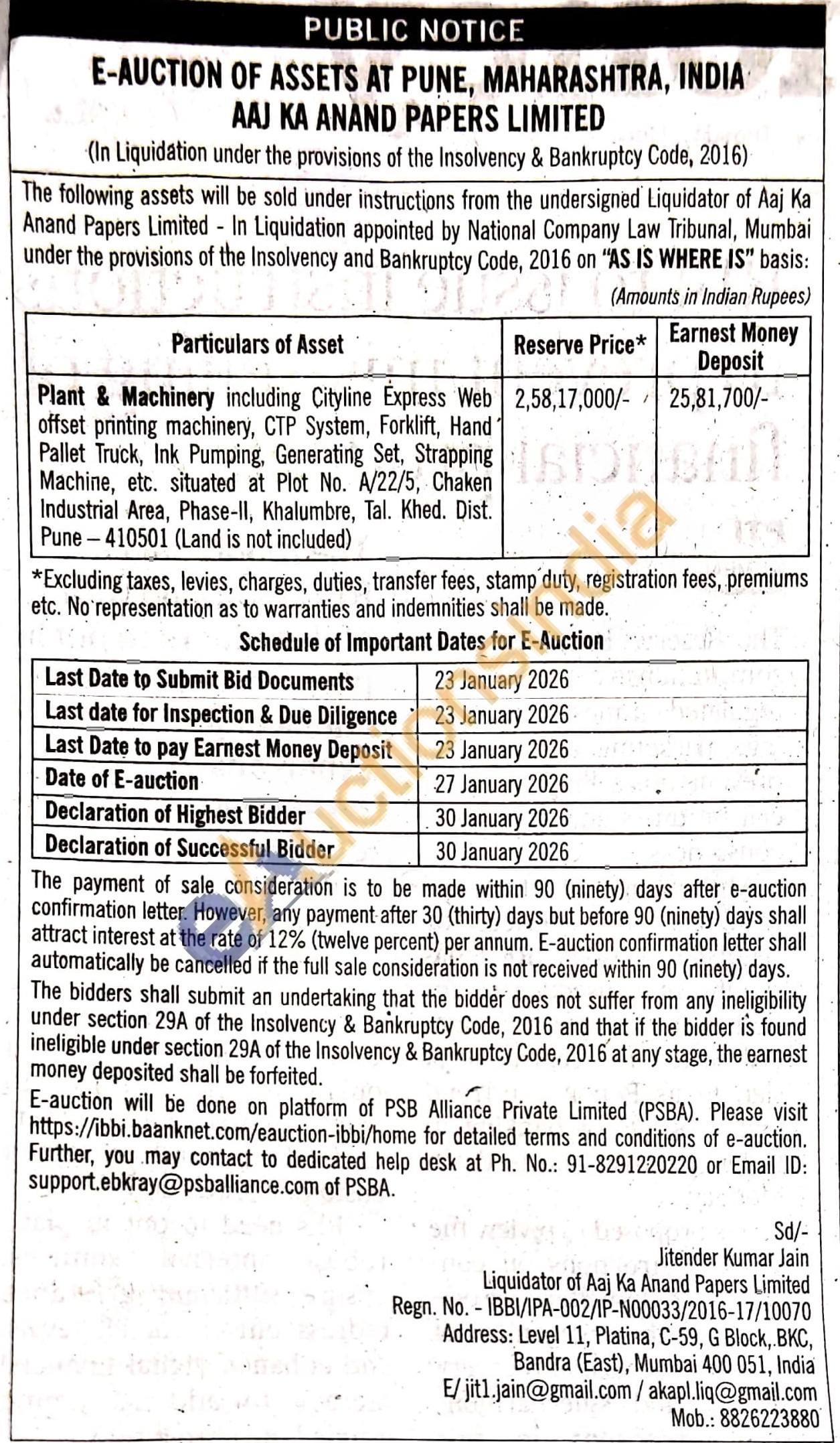 Plant & Machinery including Cityline Express Web offset printing machinery, CTP System, Forklift, Hand Pallet Truck, Ink Pumping, Generating Set, Strapping Machine, etc. situated at Plot No. A/22/5, Chaken Industrial Area, Phase-II, Khalumbre, Tal. Khed. Dist. Pune-410501 (Land is not included)