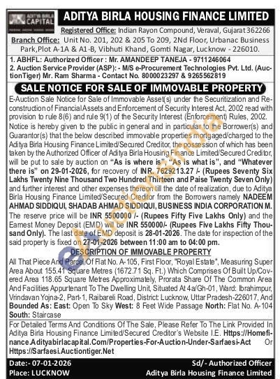 All That Piece And Parcel Of Flat No. A-105, First Floor, "Royal Estate", Measuring Super Area About 155.41 Square Metres (1672.71 Sq. Ft.) Which Comprises Of Built Up/Cov-ered Area 118.65 Square Metres Approximately, Prorata Share Of The Common Area And Facilities Appurtenant To The Dwelling Unit, Situated At 4a/Gh-01, Ward: Ibrahimpur, Vrindavan Yojna-2, Part-1, Raibareli Road, District: Lucknow, Uttar Pradesh-226017, And Bounded As: East: Open To Sky West: 8 Feet Wide Passage North: Flat No. A-104 South: Staircase