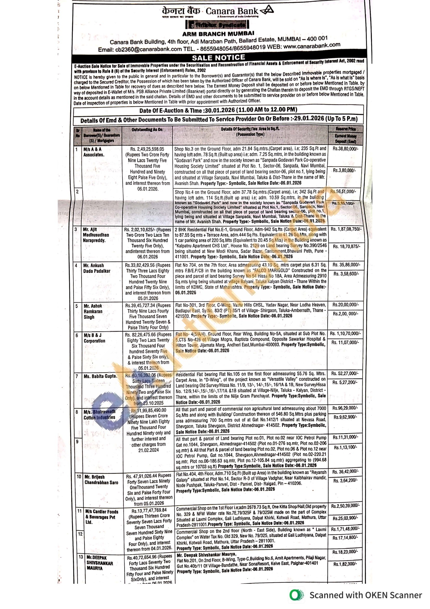 Contact Authorised Officer, Canara Bank, ARM Branch, Mumbal (Ph. No.: 8655948054/8655948019 Mob-9590913338) or Mr. Sunil Pratihast (Mob. No. 9511662963)