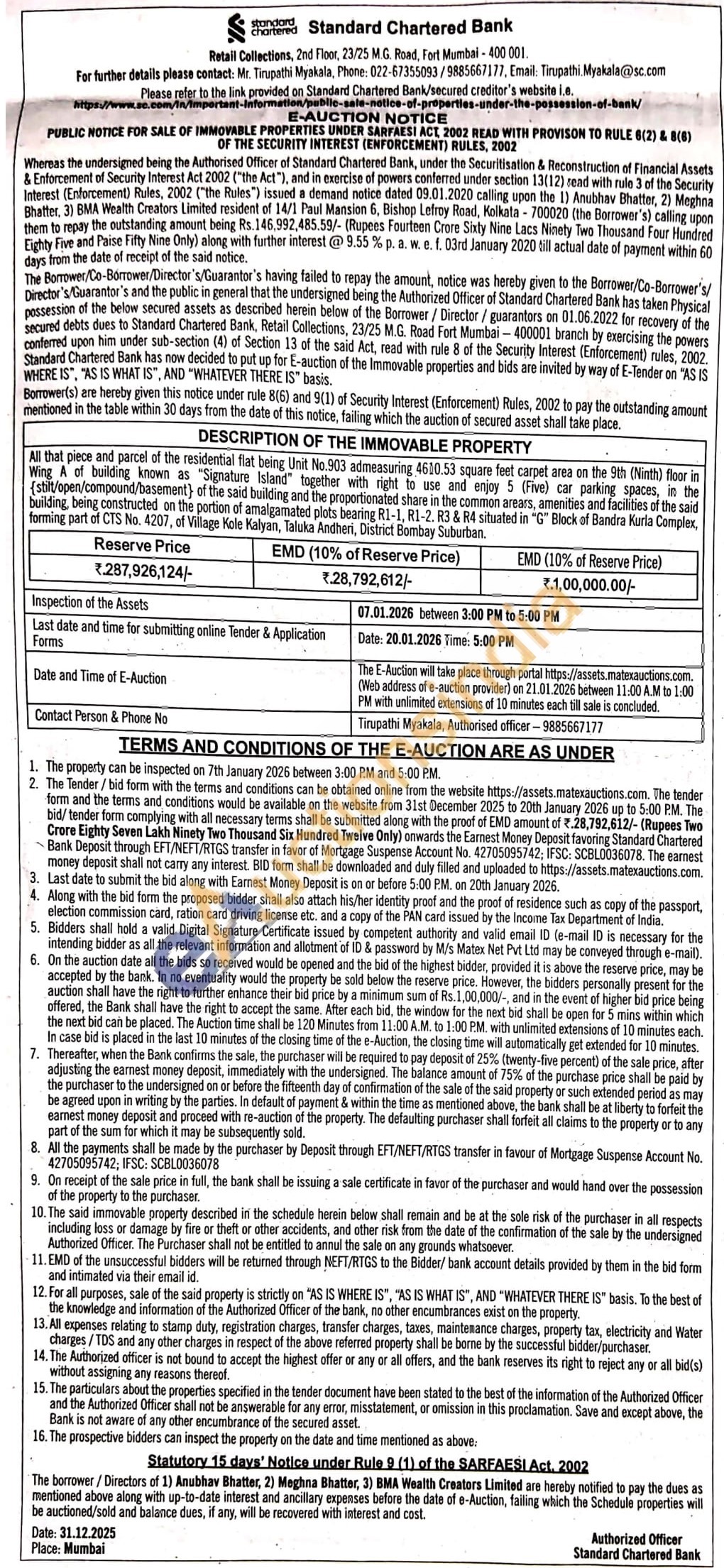 All that piece and parcel of the residential flat being Unit No.903 admeasuring 4610.53 square feet carpet area on the 9th (Ninth) floor in Wing A of building known as "Signature Island" together with right to use and enjoy 5 (Five) car parking spaces, in the {stilt/open/compound/basement) of the said building and the proportionated share in the common arears, amenities and facilities of the said building, being constructed on the portion of amalgamated plots bearing R1-1, R1-2. R3 & R4 situated in "G" Block of Bandra Kurla Complex, forming part of CTS No. 4207, of Village Kole Kalyan, Taluka Andheri, District Bombay Suburban