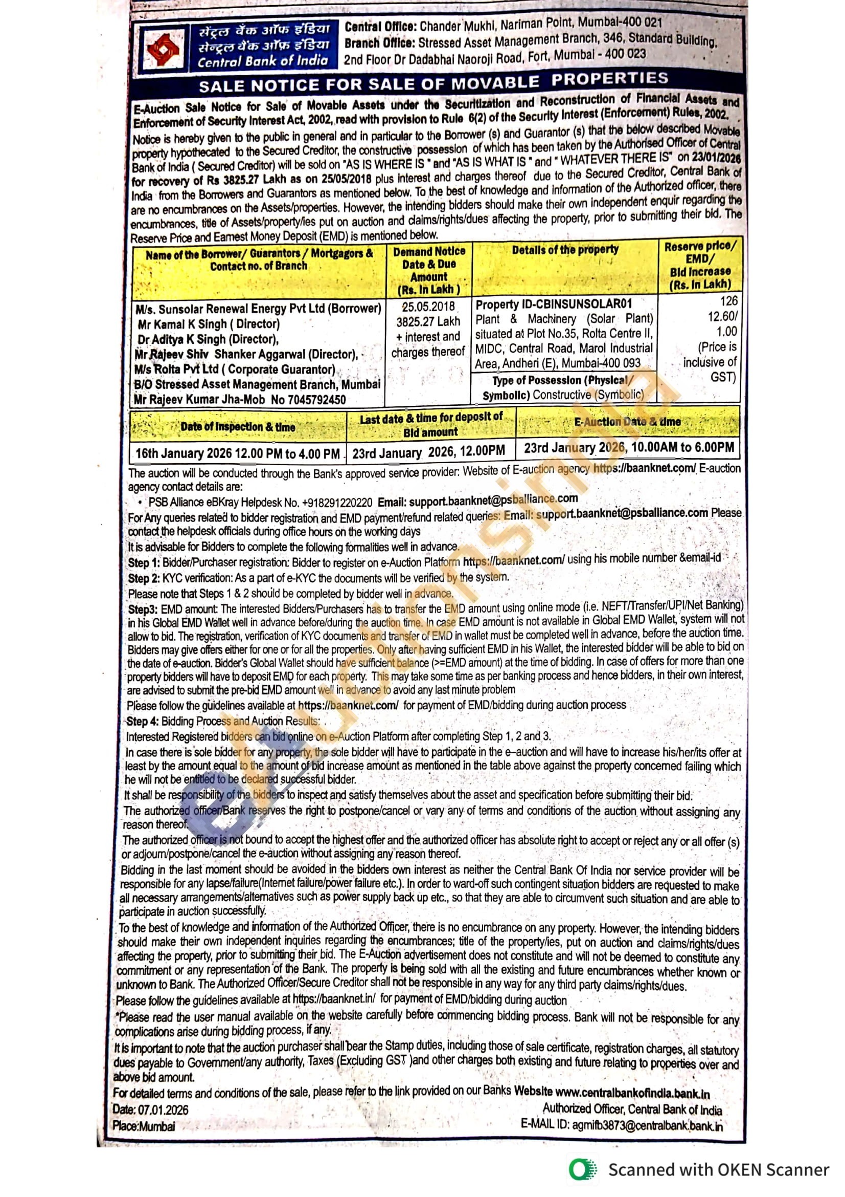 Property ID-CBINSUNSOLAR01 Plant & Machinery (Solar Plant) situated at Plot No.35, Rolta Centre II, MIDC, Central Road, Marol Industrial Area, Andheri (E), Mumbai-400 093