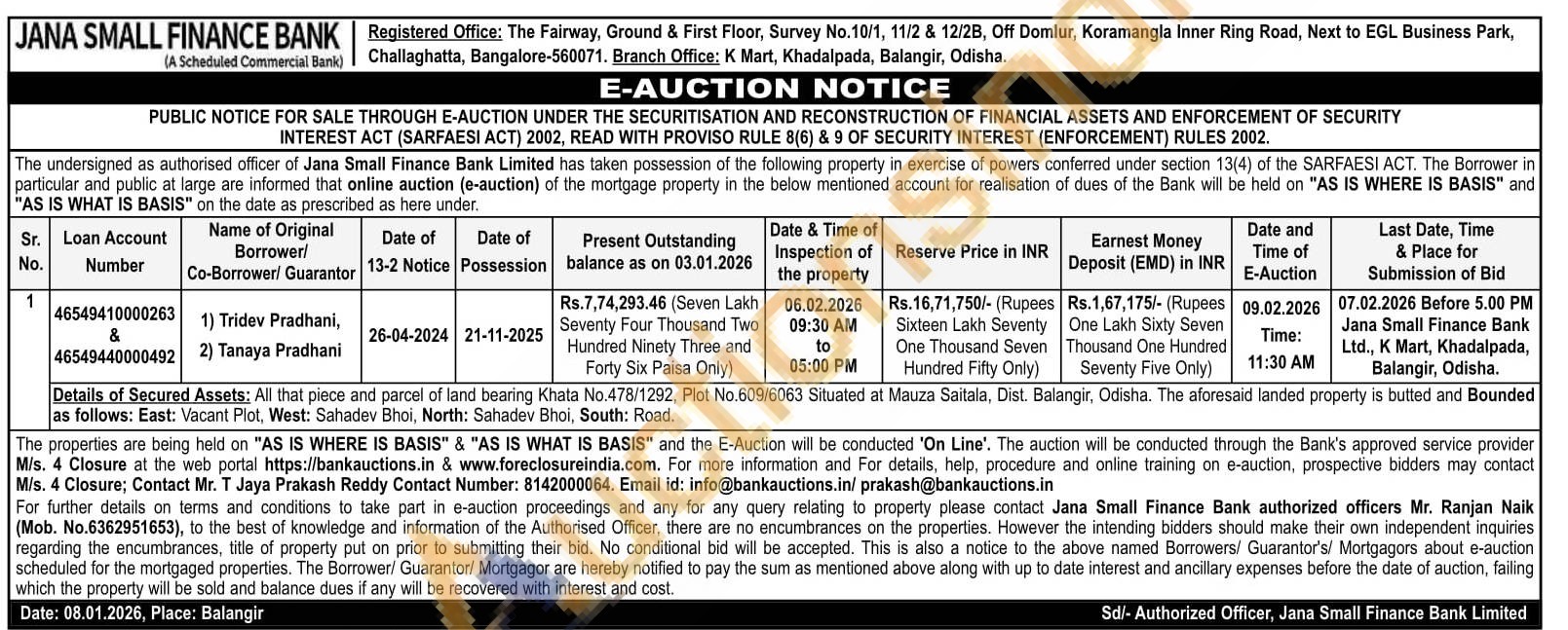 Details of Secured Assets: All that piece and parcel of land bearing Khata No.478/1292, Plot No.609/6063 Situated at Mauza Saitala, Dist. Balangir, Odisha. The aforesaid landed property is butted and Bounded as follows: East: Vacant Plot, West: Sahadev Bhoi, North: Sahadev Bhoi, South: Road.