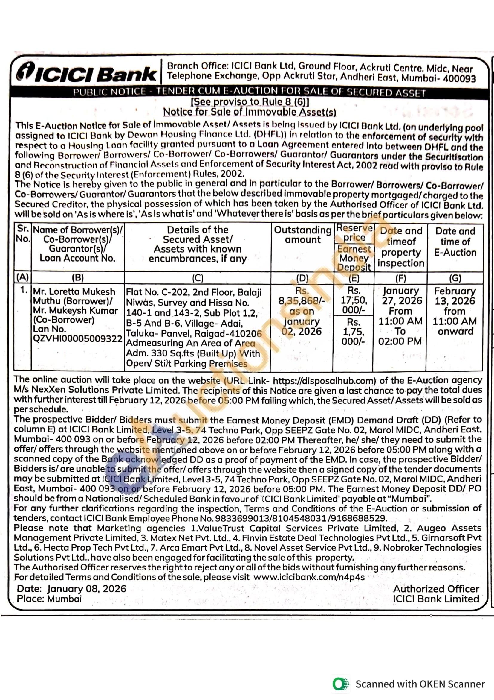 Flat No. C-202, 2nd Floor, Balaji Niwas, Survey and Hissa No. 140-1 and 143-2, Sub Plot 1,2, B-5 And B-6, Village- Adai, Taluka Panvel, Raigad-410206 Adm. 330 Sq.fts (Built Up) With Open/Stilt Parking Premises Admeasuring An Area of Area